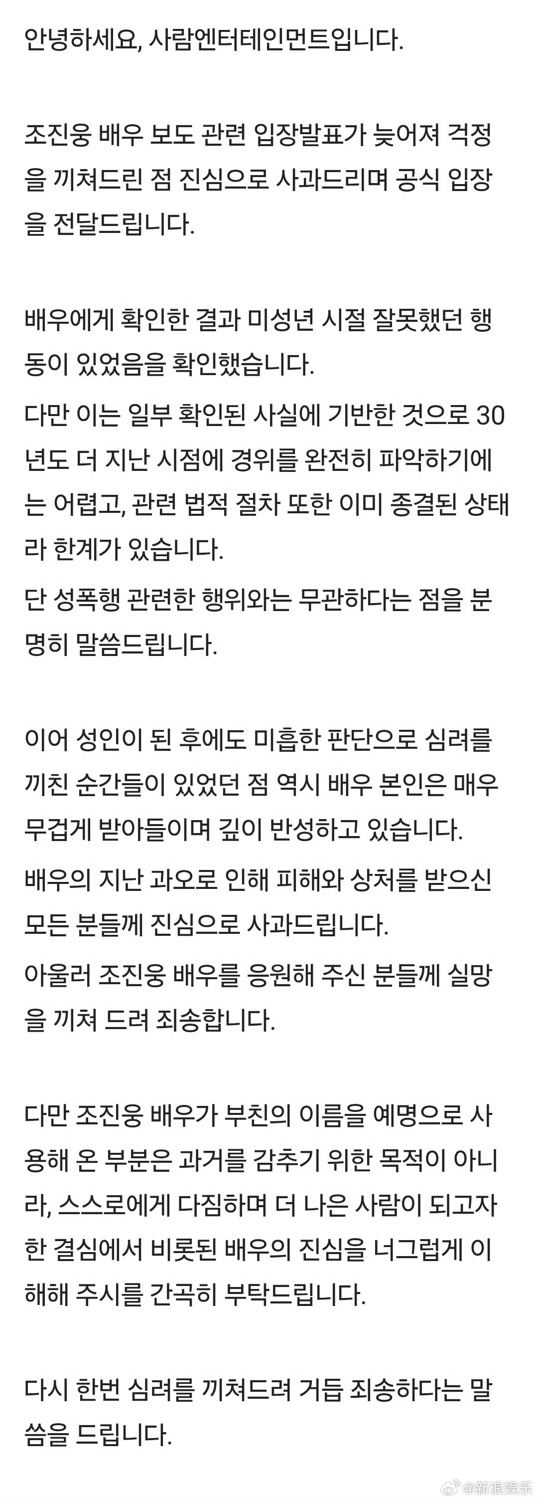 12月5日,韩媒。刚刚,赵震雄公司发文承认其儿时存在犯罪事实,但否认性...