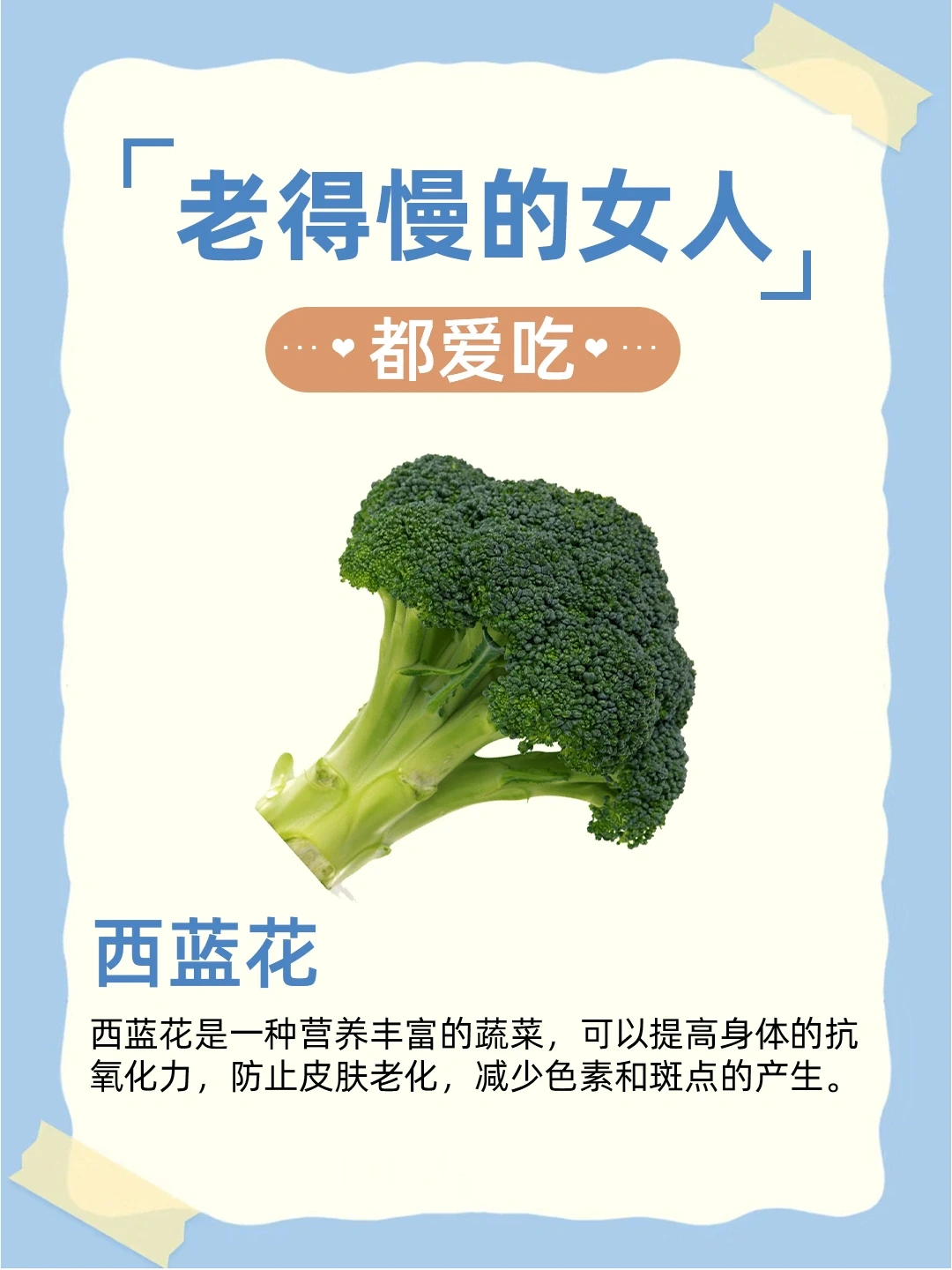 西蓝花是一种营养丰富的蔬菜,可以提高身体的抗氧化力,防止皮肤老化,减少色素和斑点的产生。