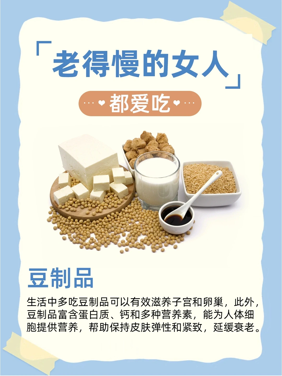 生活中多吃豆制品可以有效滋养子宫和卵巢,此外,豆制品富含蛋白质、钙和多种营养素,能为人体细胞提供营养,帮助保持皮肤弹性和紧致,延缓衰老。
