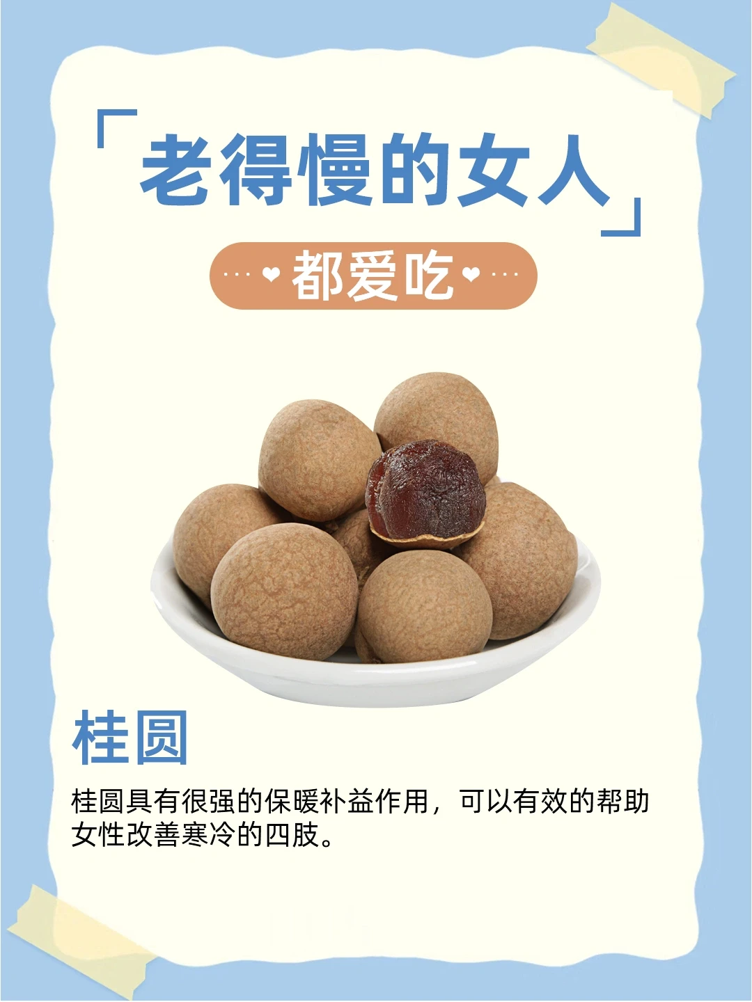 桂圆具有很强的保暖补益作用,可以有效的帮助女性改善寒冷的四肢。