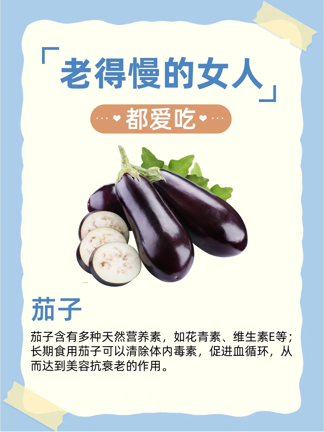茄子含有多种天然营养素,如花青素、维生素E等;长期食用茄子可以清除体内毒素,促进血循环,从而达到美容抗衰老的作用。