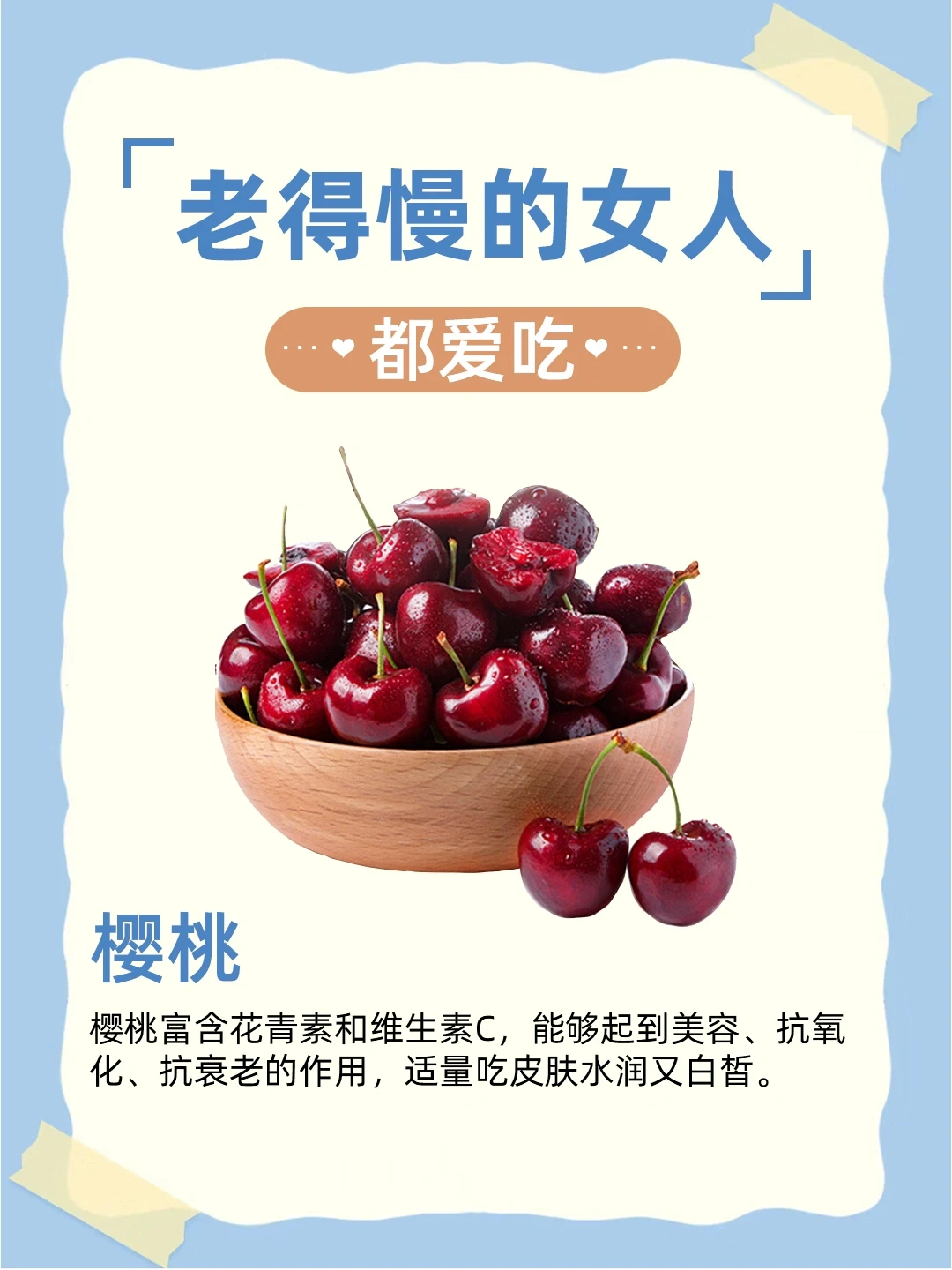 樱桃富含花青素和维生素C,能够起到美容、抗氧化、抗衰老的作用,适量吃皮肤水润又白皙。