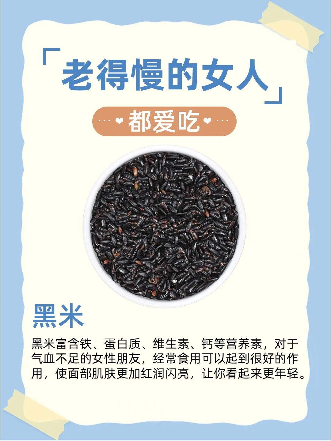 黑米富含铁、蛋白质、维生素、钙等营养素,对于气血不足的女性朋友,经常食用可以起到很好的作用,使面部肌肤更加红润闪亮,让你看起来更年轻。