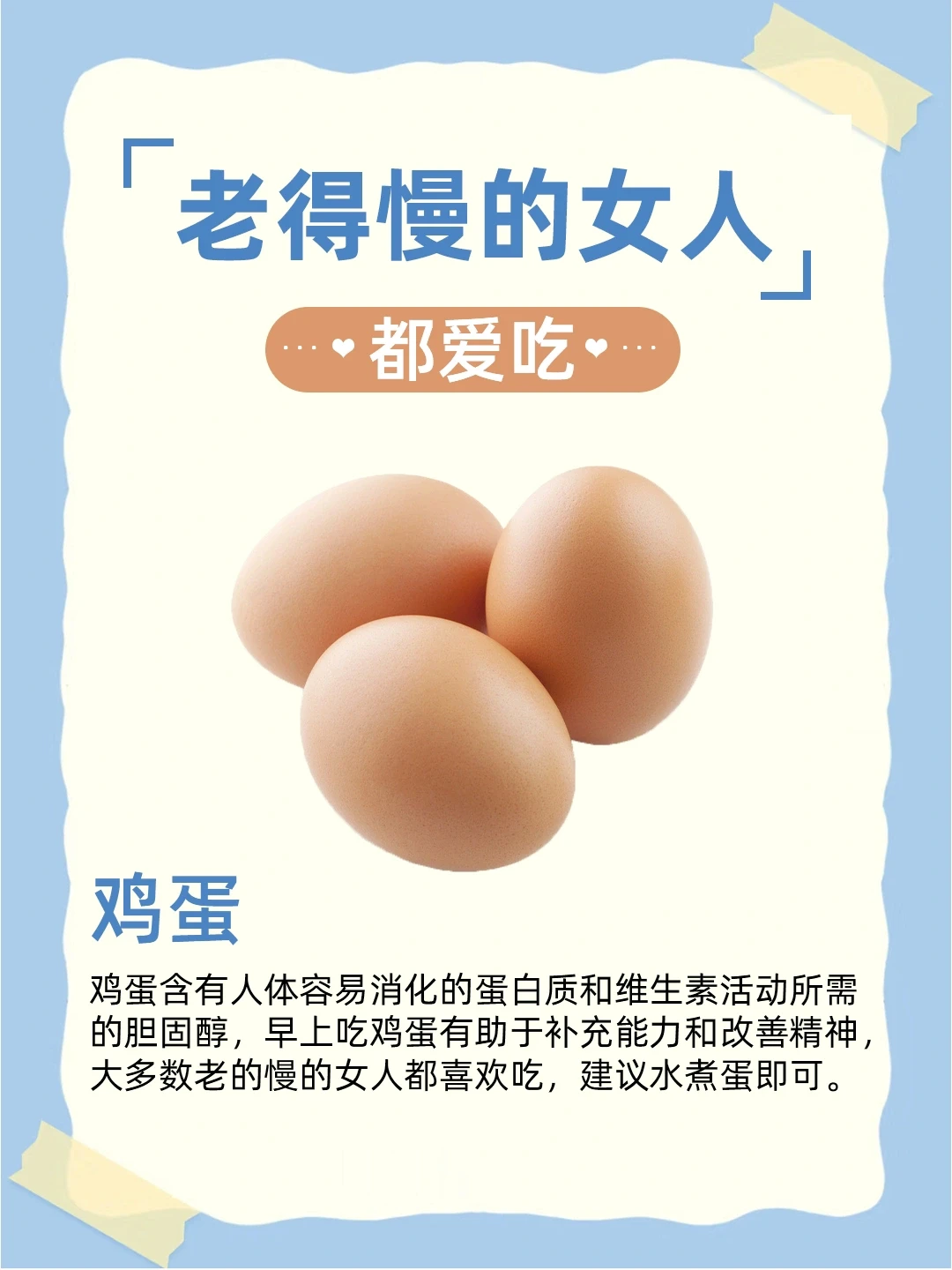 鸡蛋含有人体容易消化的蛋白质和维生素活动所需的胆固醇,早上吃鸡蛋有助于补充能力和改善精神,大多数老的慢的女人都喜欢吃,建议水煮蛋即可。