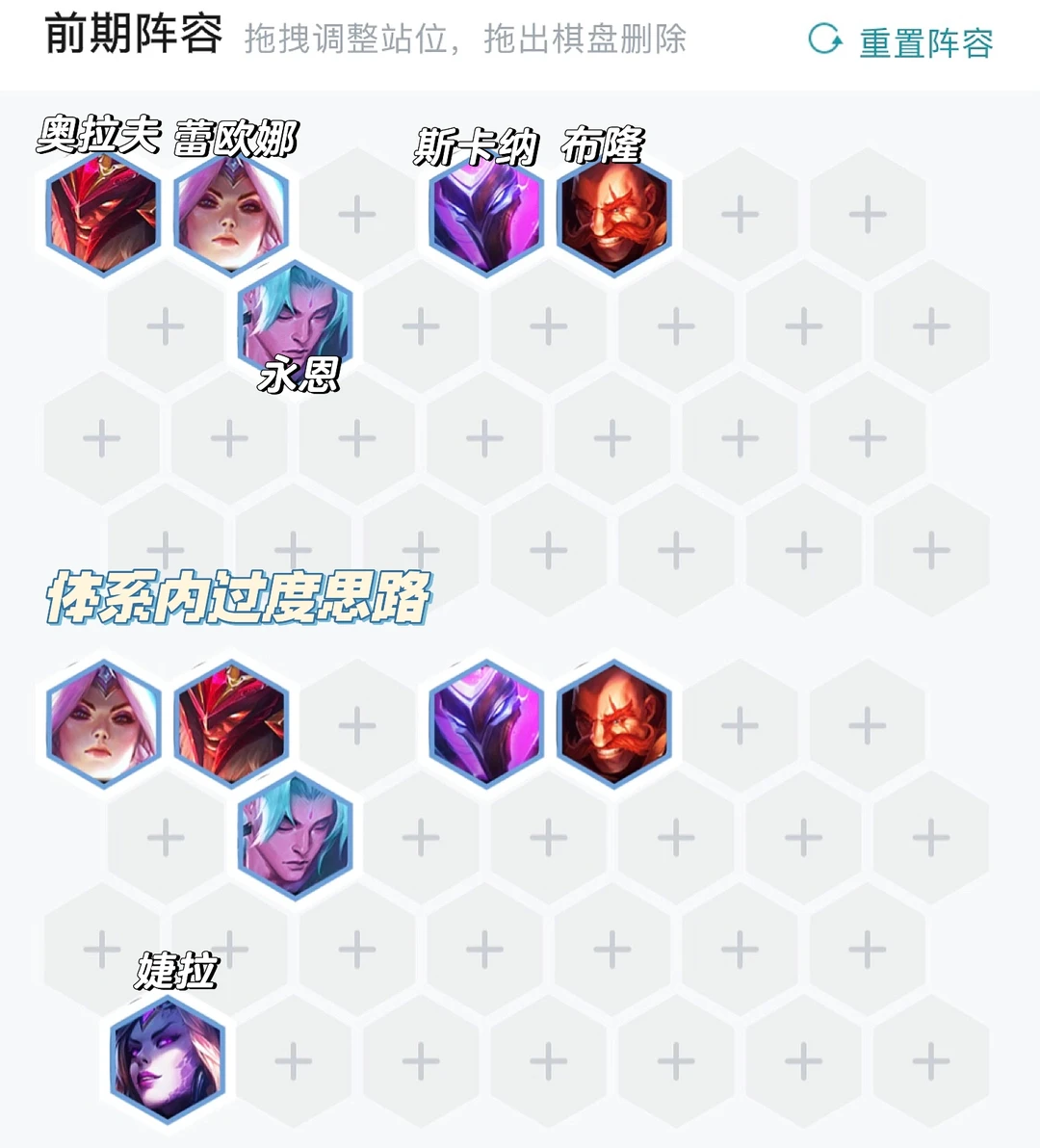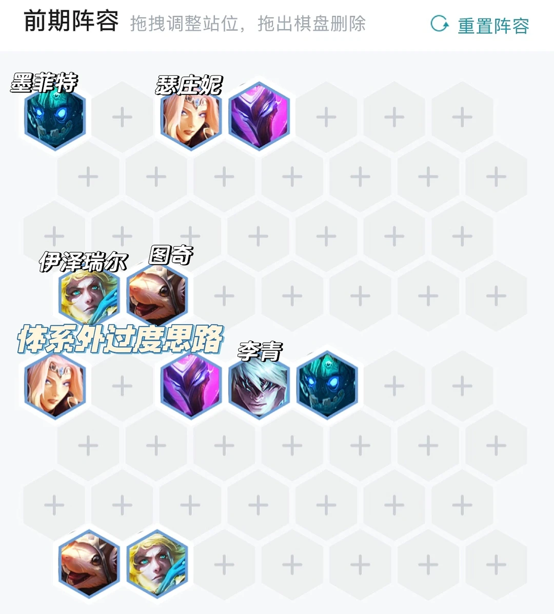 前期可以用体系内牌打工,一般有二星日女加永恩就搭配护卫狂刃战士即可。也可以用体系外的百搭过度冒险斗射也是不错的选择。