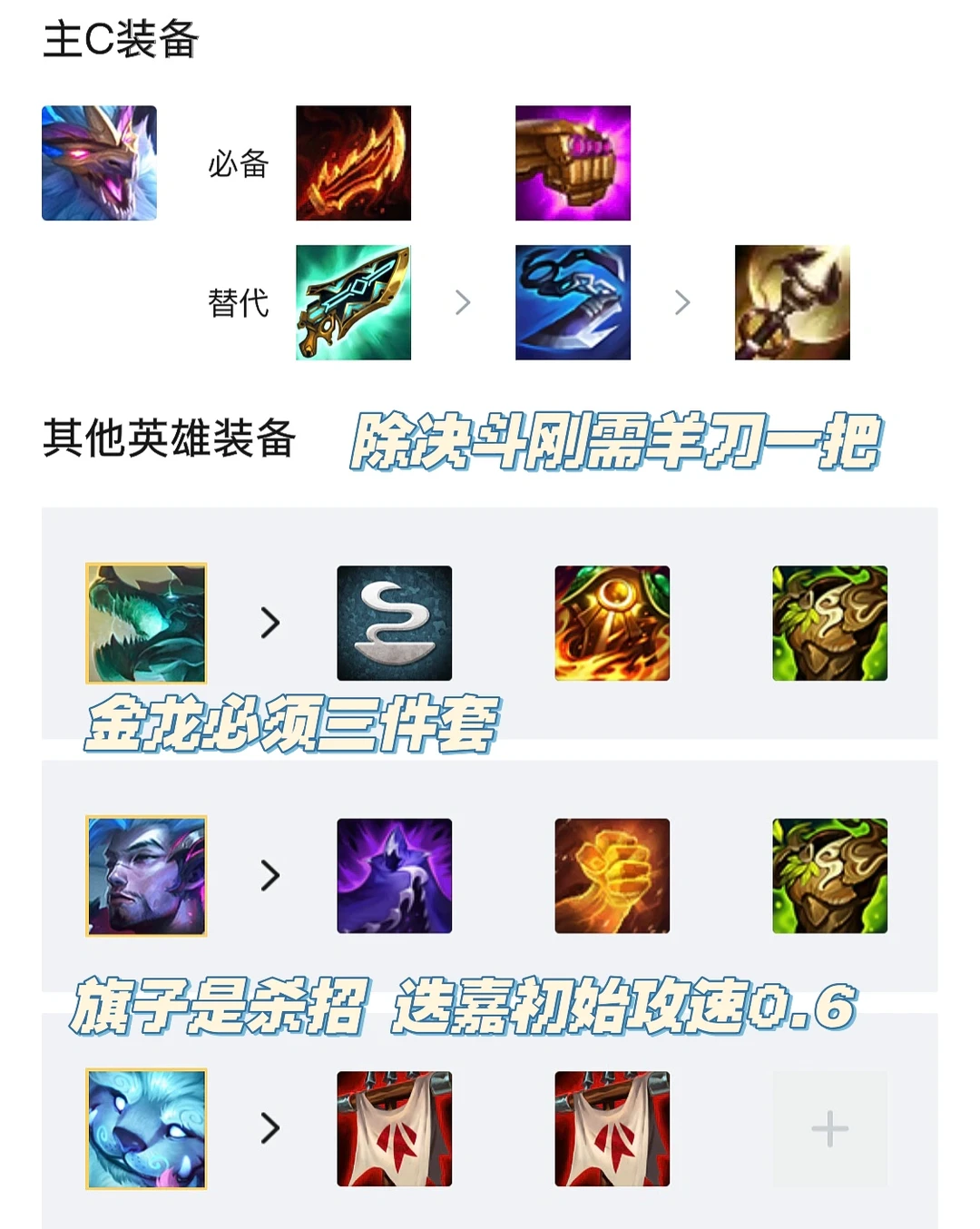 装备思路:迭嘉除了决斗幻境都要出一把羊刀,因为这版本没有璐璐给迭嘉启动了。迭嘉初始攻速只有0.6了,特别特别慢,所有有旗子直接做就好,前排艾达丝肉装找到之后,最后最后再给亚索补点装备锦上添花即可。