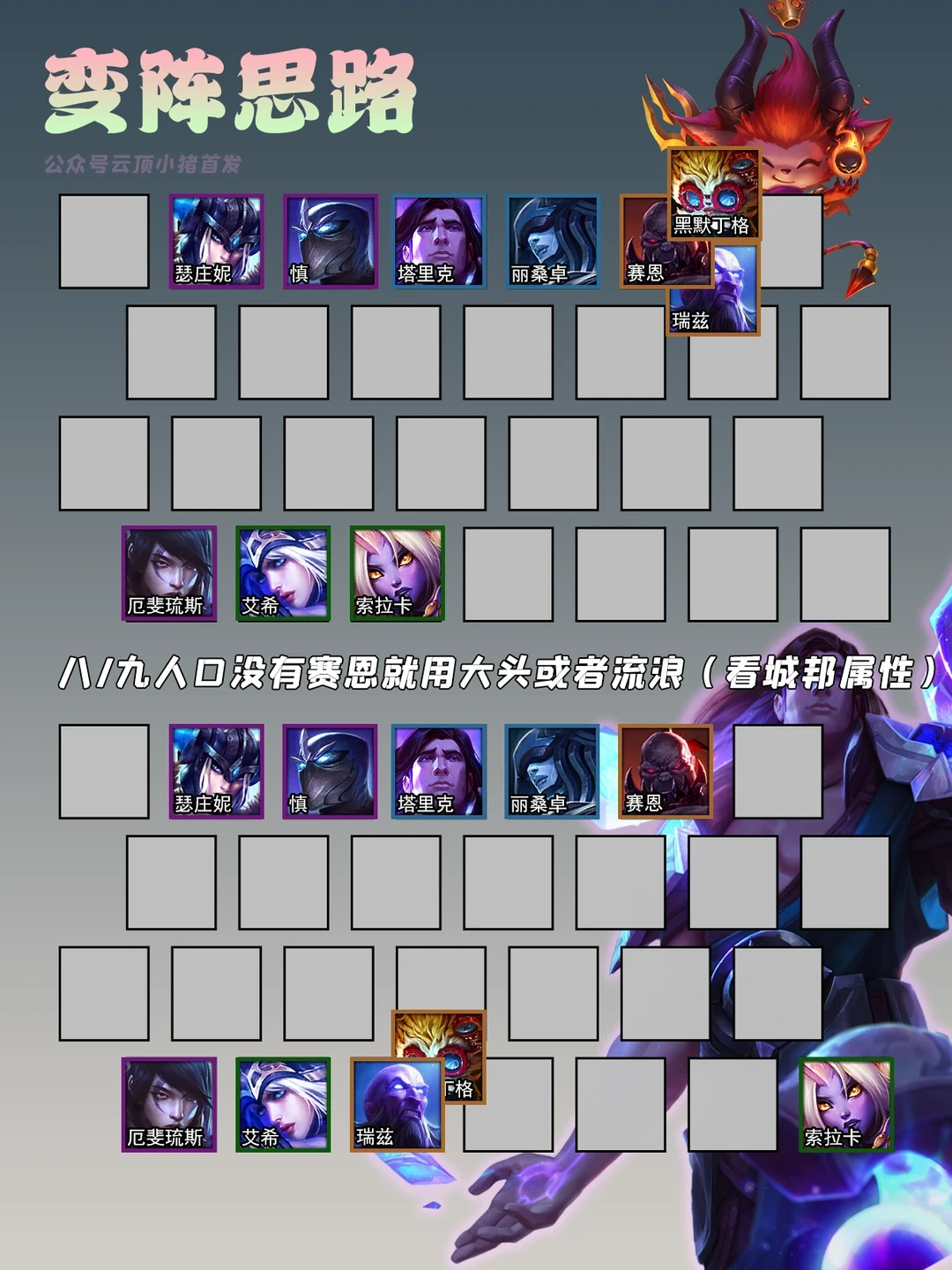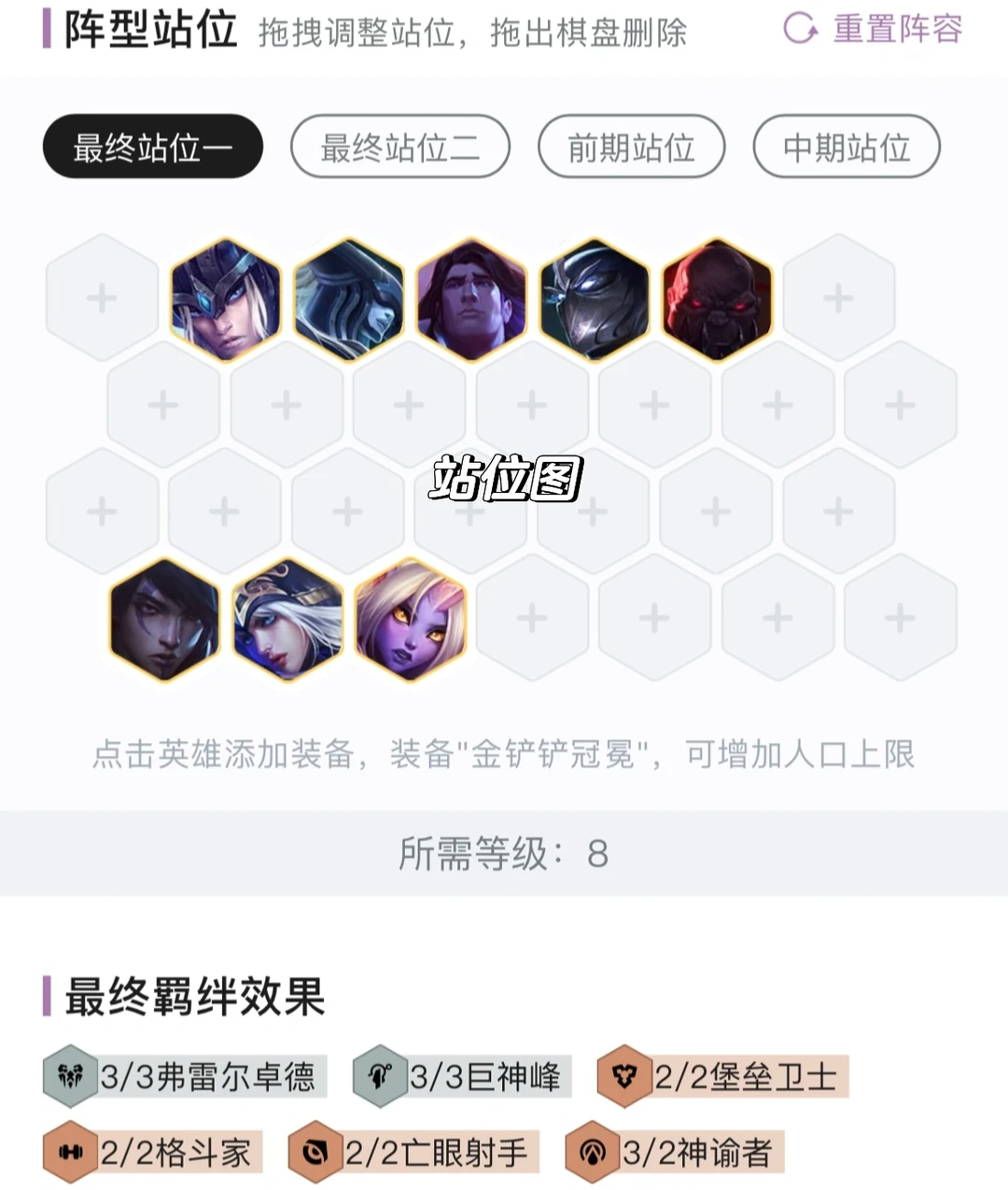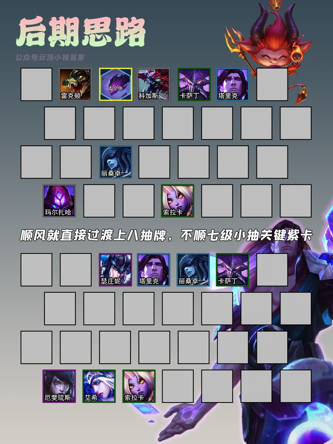 中期一般就按羁绊配棋子就OK,7人口小抽一张厄斐琉斯和猪妹,其他基础牌抽两三个二星就可以上8了,如果特别顺也可以4-5上8,然后4-5或者5-1左右抽牌。