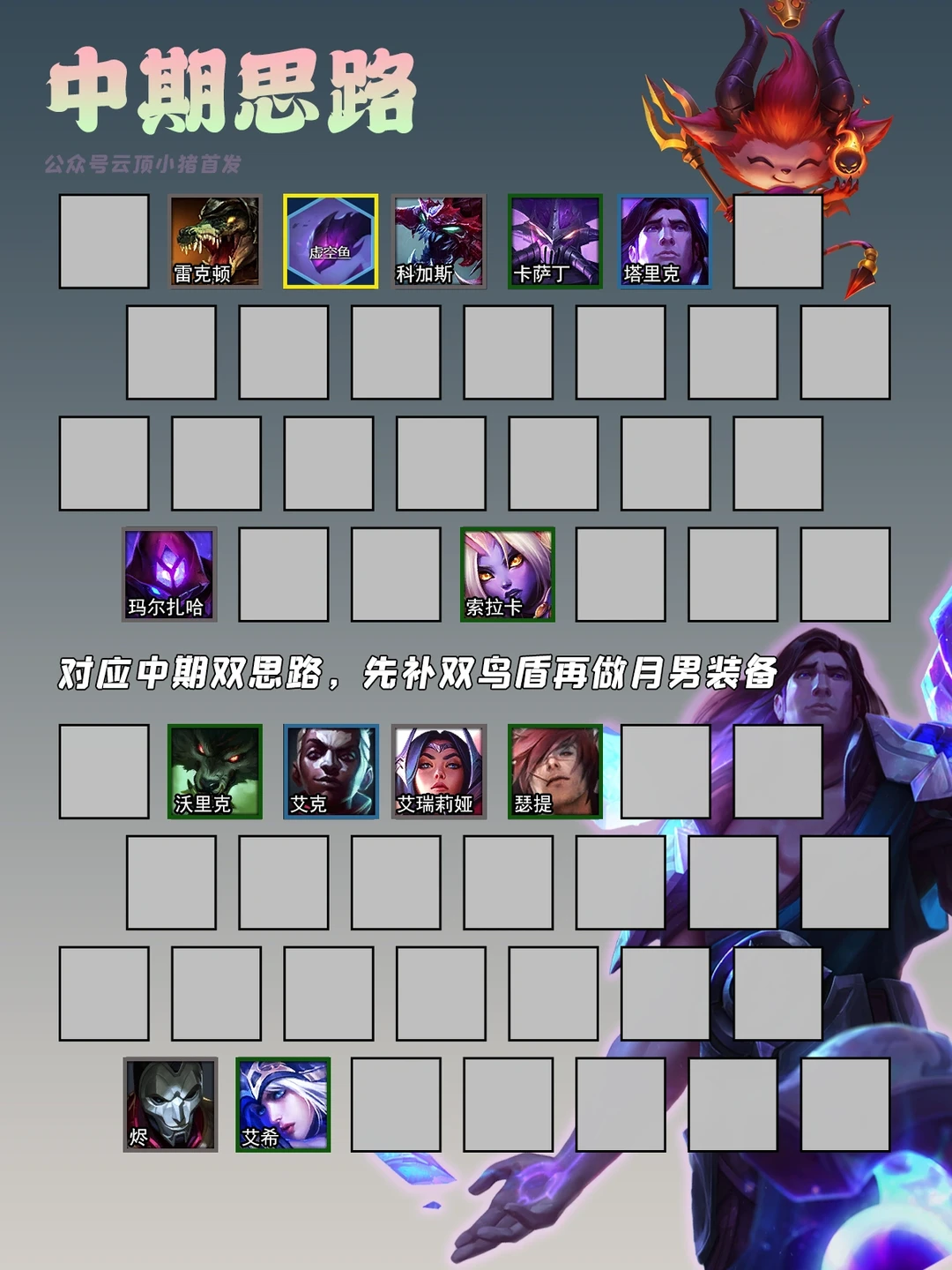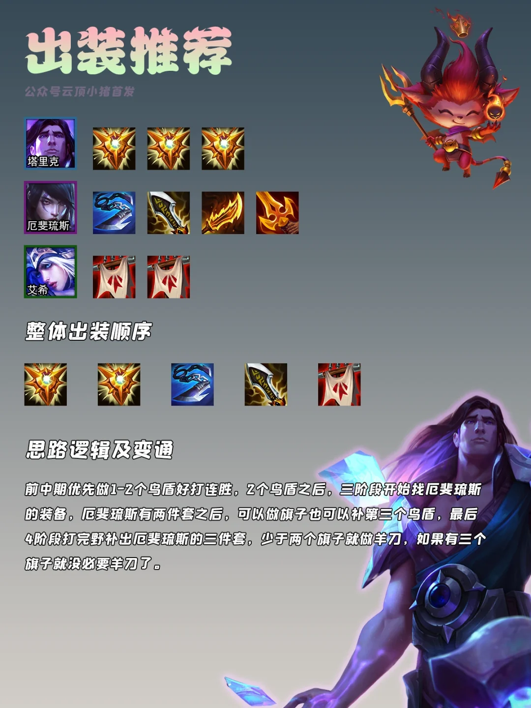 [氛围感R]装备思路:前中期优先做1-2个鸟盾好打连胜,2个鸟盾之后,三阶段开始找厄斐琉斯的装备,厄斐琉斯有两件套之后,可以做旗子也可以补第三个鸟盾,