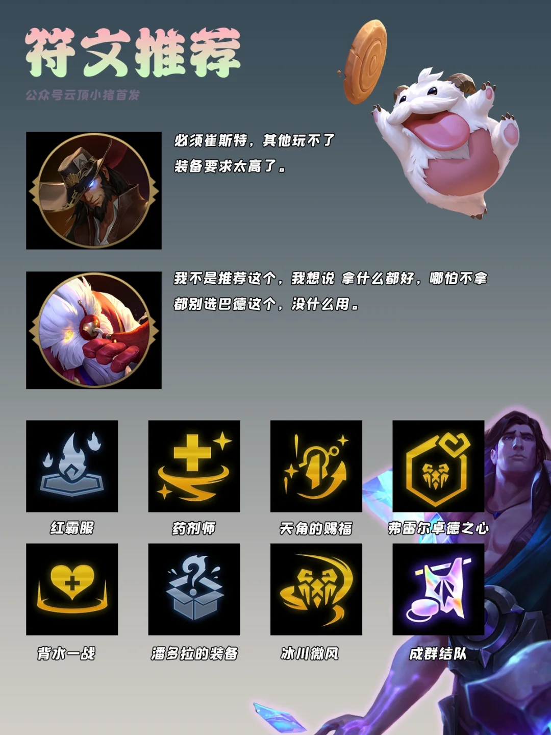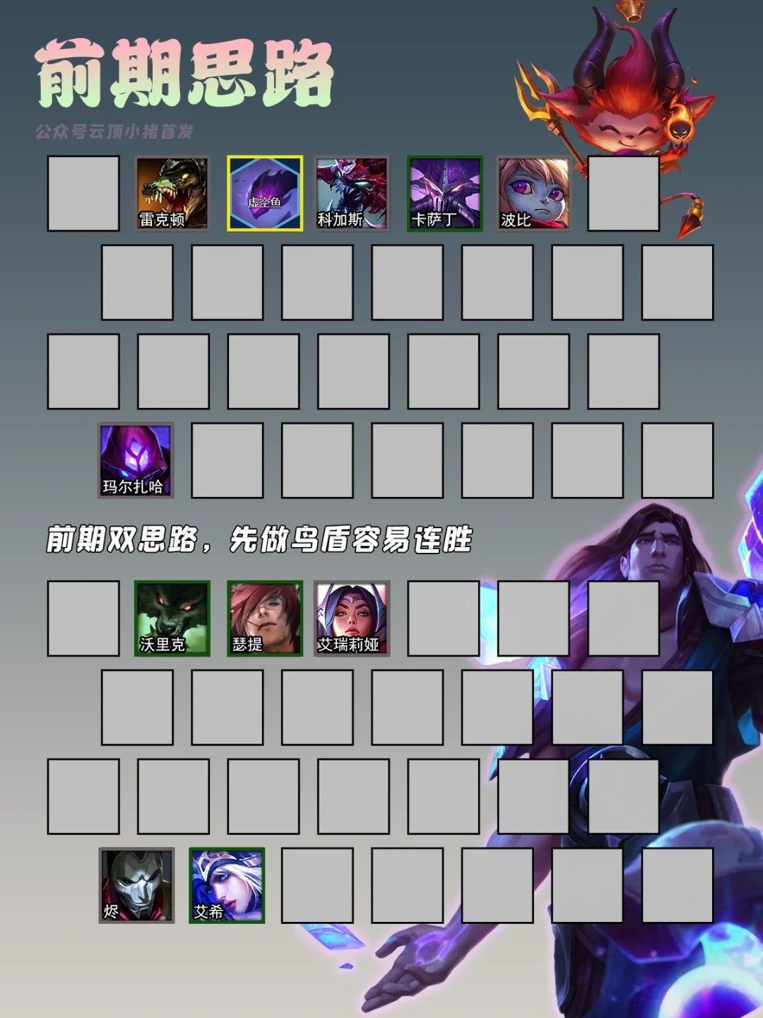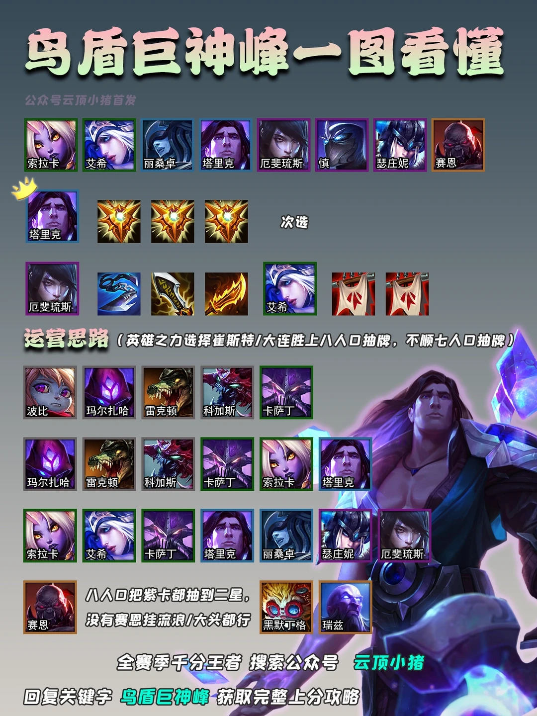 1、这个阵容关键就是巨神峰羁绊配合鸟盾前排太肉了,前期要优先做两个鸟盾出来,还是唯一推荐英雄强化拿崔斯特。