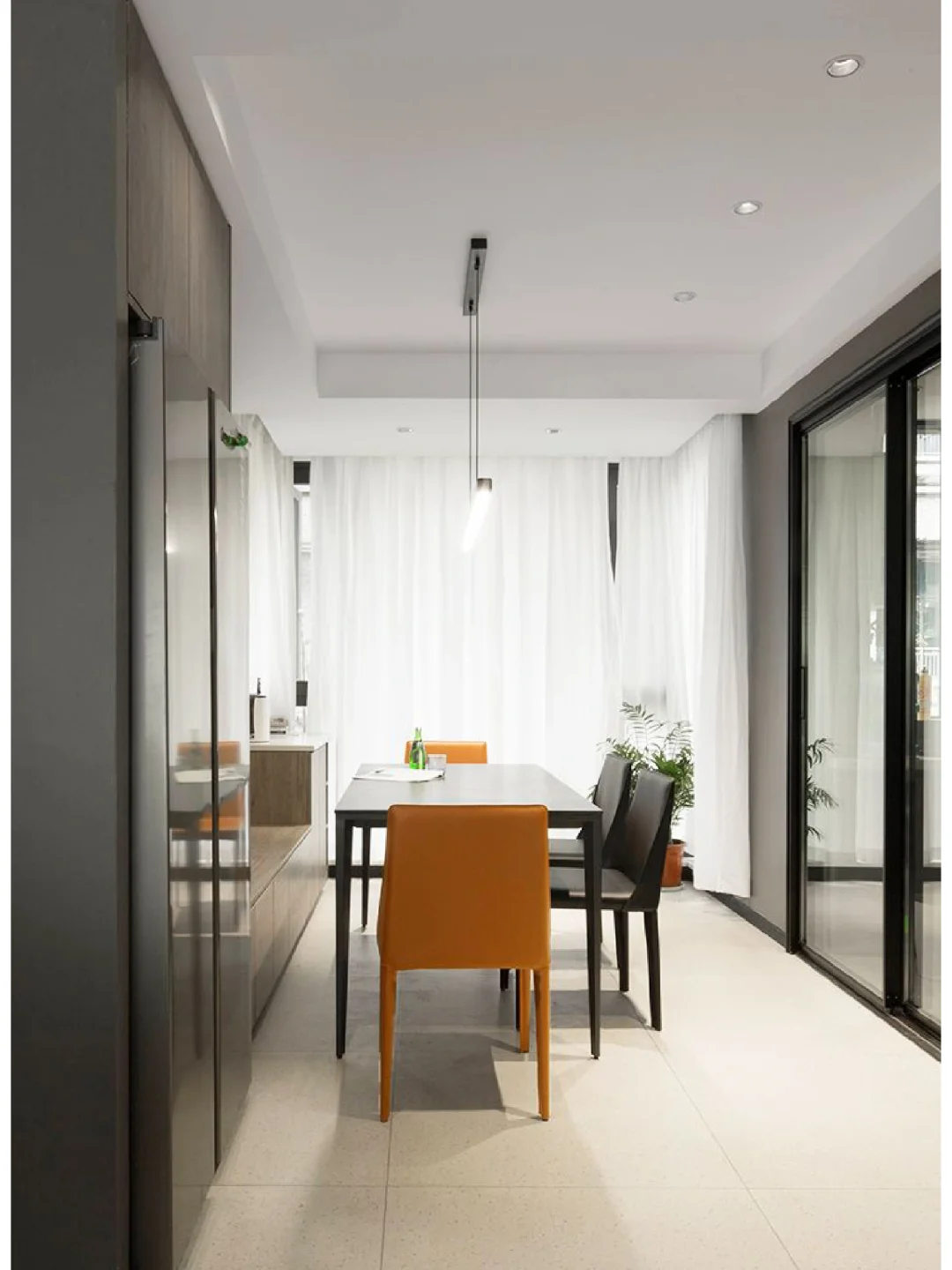 ☘️客餐厅选择地砖通铺,表现出强烈的整体性,但巧妙的用一个内嵌式冰箱+一个过道拐角做了一个不是很刻意的隔断。实木餐桌+跳色餐椅为这个沉稳的氛围增添了一丝俏皮~