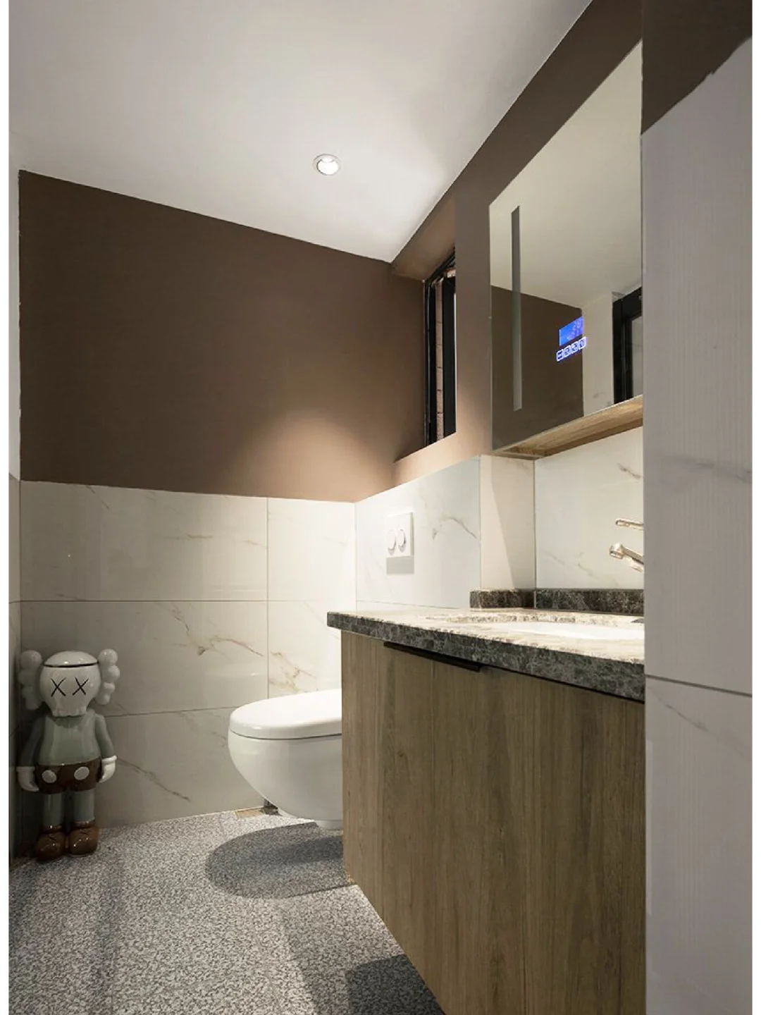 ☘️卫生间延续整个空间的奶茶色调,布局合理,镜柜+吊柜+台下盆可谓是卫生间设计的标准答案,功能明确。