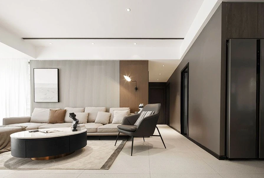 ☘️沙发背景墙选择实木护墙板,无主灯的设计别具一格。柔软的科技布大沙发+岩板大茶几,配上美观的毛绒地毯,干净又舒适~
