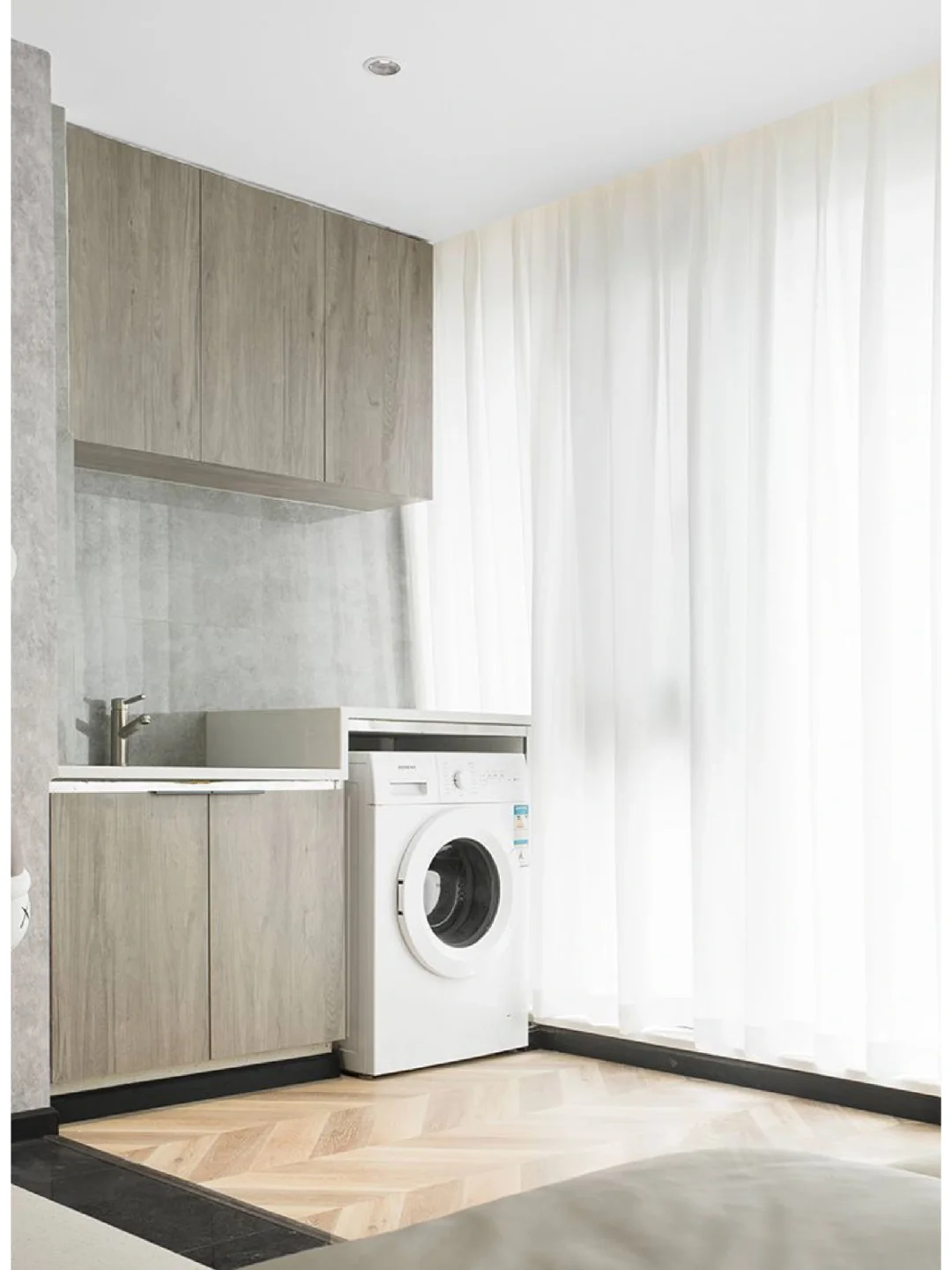 ☘️客厅阳台选择打通,使整体的空间更加宽敞开阔。选择做了一个干区的设计,内嵌式洗衣机节省空间又兼具美观。