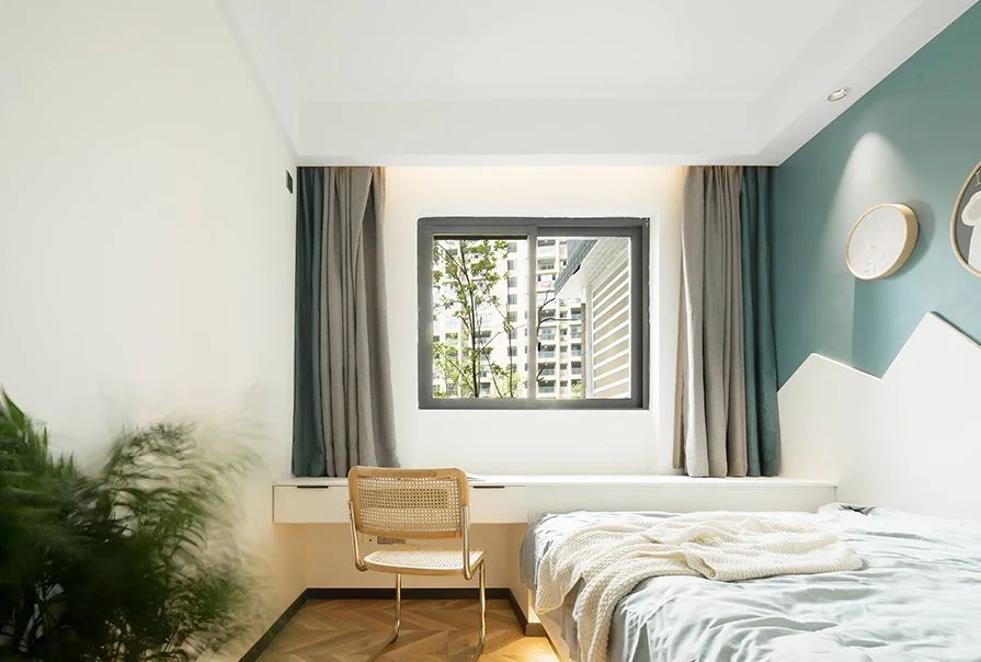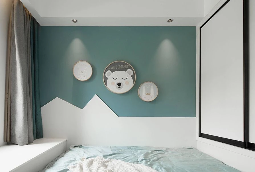 ☘️儿童房选择定制柜子做书桌床头,背景墙用蓝色+白色乳胶漆,搭配上童趣背景装饰画,使得空间氛围变得活泼。在另一面背景墙防止投影幕布,在家里也能看大片~