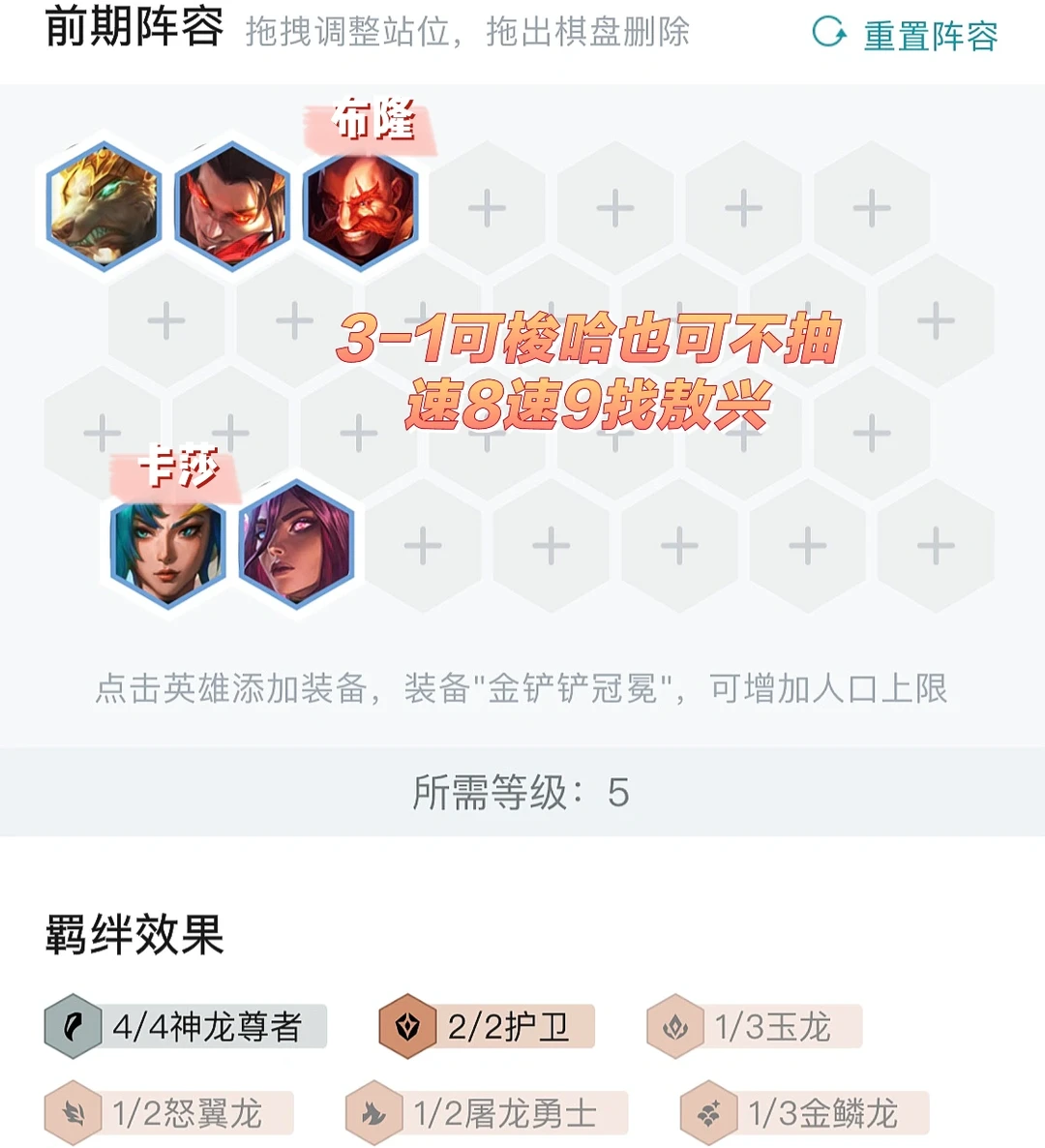 正常不拉人看,前期连败到3-1,然后猛抽提质量,3阶段卡30左右追出三星狗头上人口。如果是不追三星可以2-1拉4,2-3拉5,3-1拉6,3-5拉7打节奏压制直接奔着神龙敖兴去。