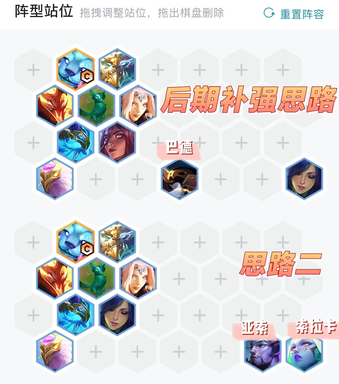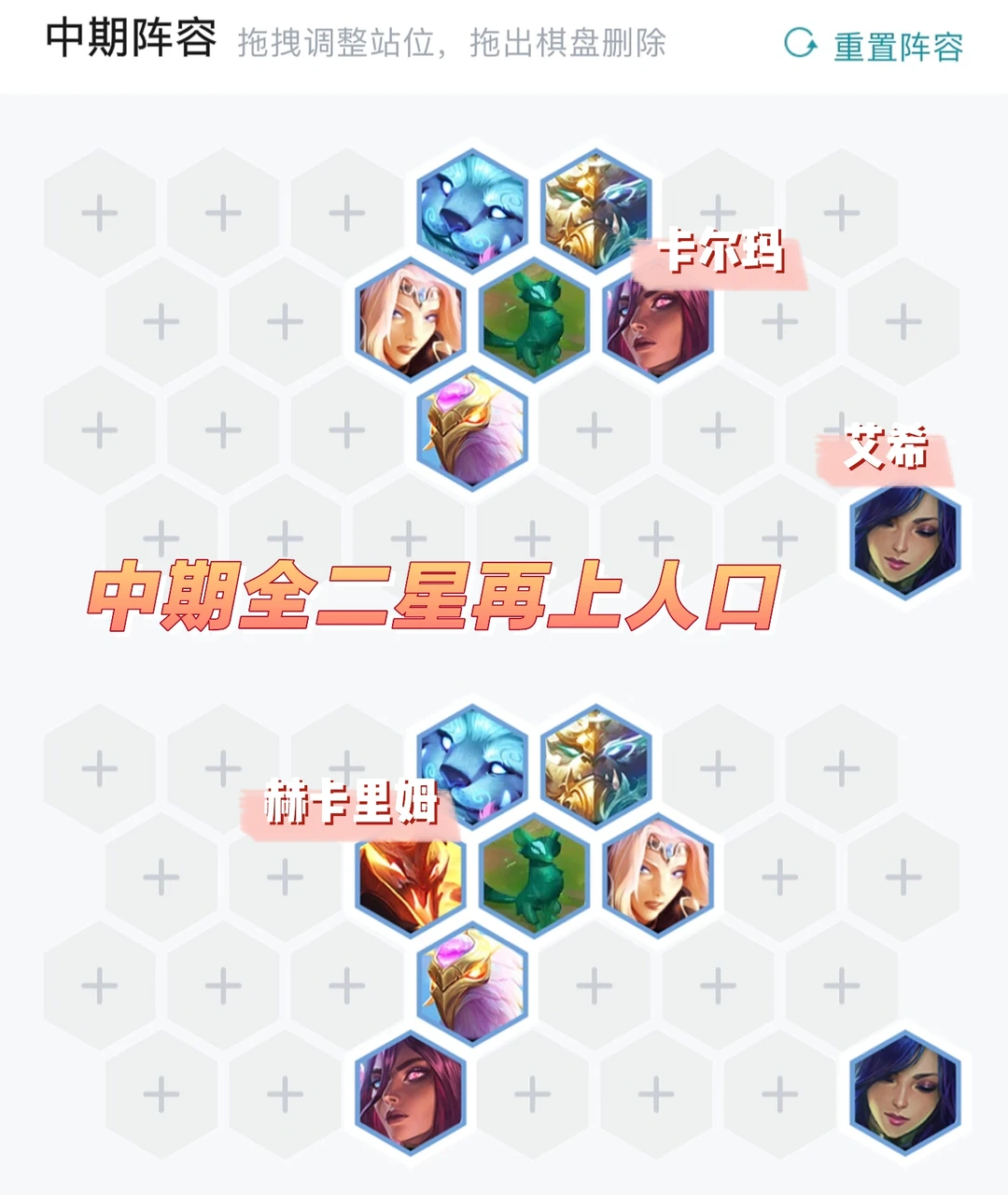 7人口把所有三费及以下的牌抽到二星,如果血量高于50,且质量随便连胜就准备上8,否则7人口追出三星努努或者狗熊再上8,三星提升远远大于上8人口。