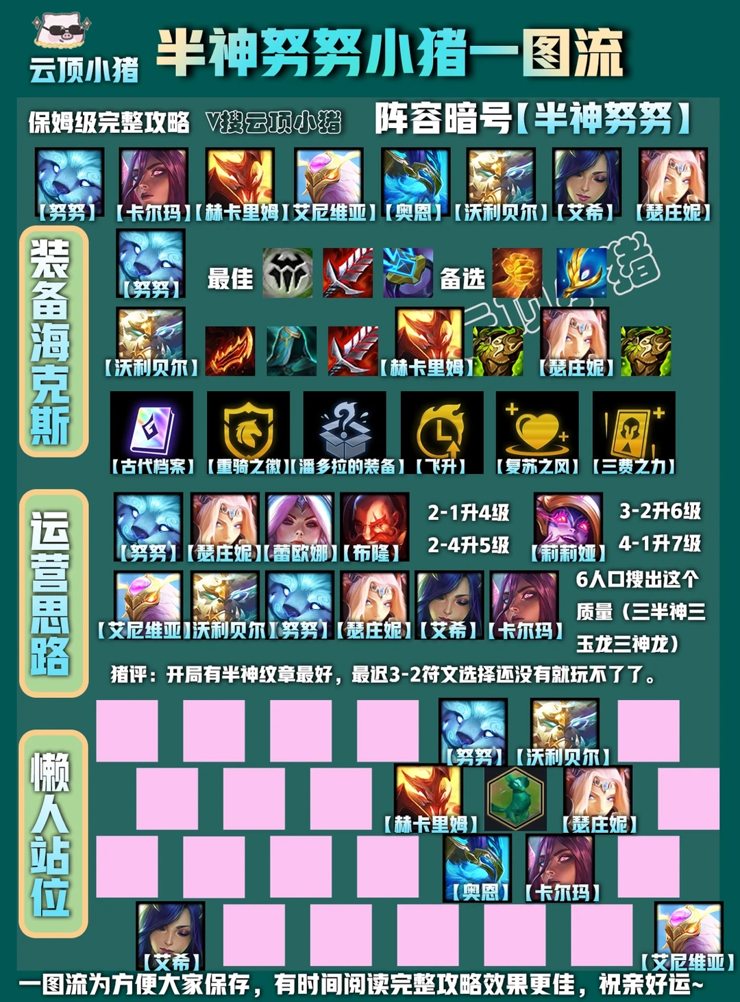 开局半神转来了直接冲,顺便看一下幻境属性,热门属性可能有人会卡努努,一般没人卡就特别容易三星。最迟3-2没有半神转职就别硬赌了,可以转狗熊/凤凰或者其他阵容都行。