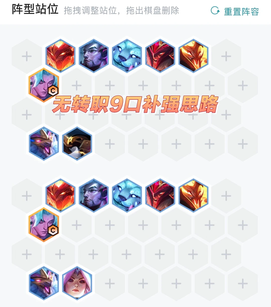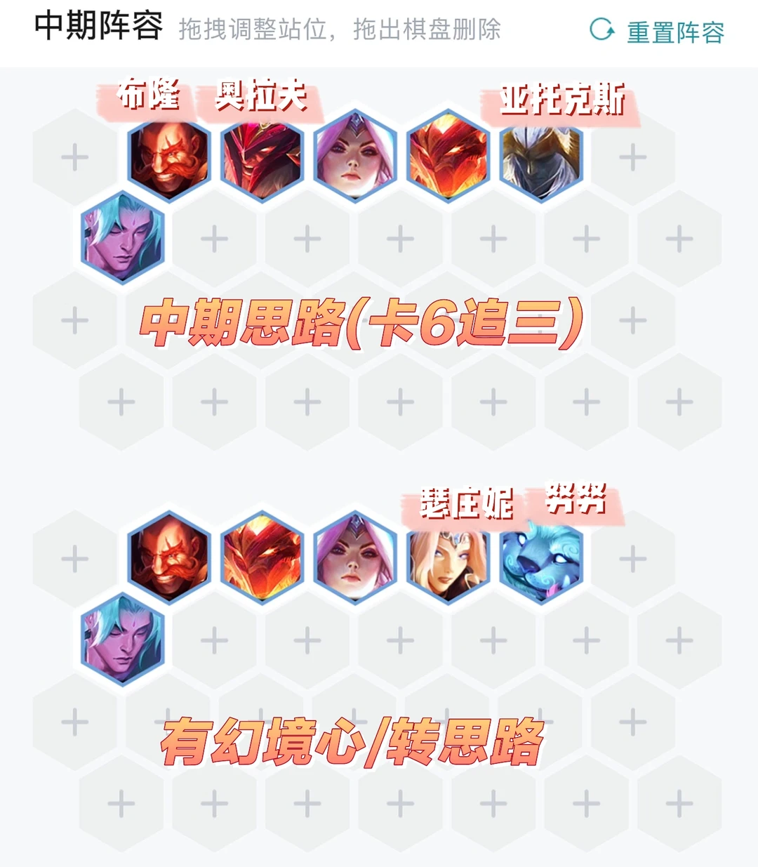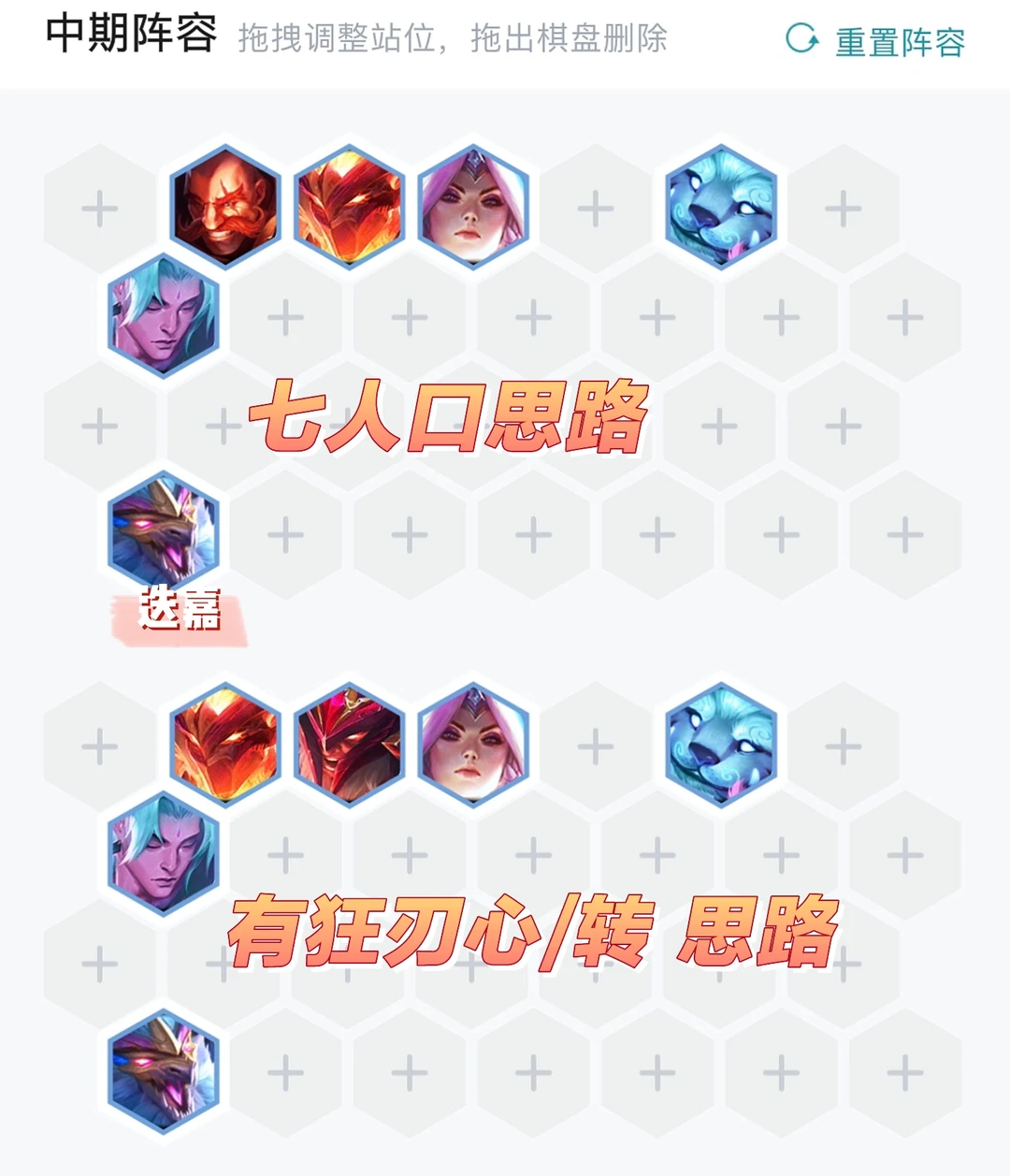 后期根据有无转职、强化符文灵活变阵,端游里更偏向于开高幻境或者6狂刃(加强了)也行,金铲铲里则偏向于无脑堆狂刃战士(出羊刀)。