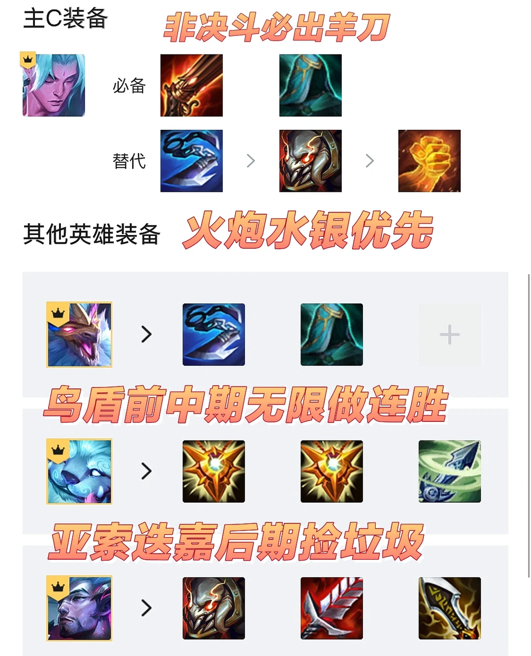 永恩优先火炮水银,实在没有火炮可以做羊刀,巨杀清理前排更快,如果没有做火炮最好做一个续航装或者续航符文。鸟盾无限做,吹风能做就做一个可以突破特别肉的前排,后期迭嘉亚索捡垃圾就行。