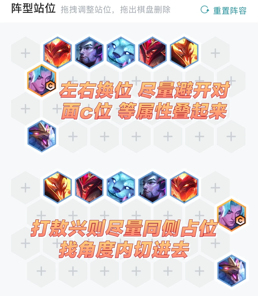 前排吃鸟盾站一起,永恩放第二排安全输出,尽量避开对面C位慢慢叠属性起来。如果没有火炮可以放第一排,放在慎旁边尽量规避伤害。