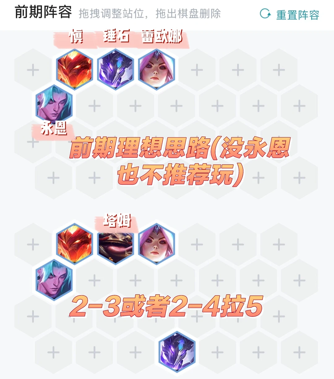 一般2-1拉4人口,2-5拉5人口,3-2拉6人口,3-2升六,小D质量。然后卡30左右利息追出三星永恩,如果阵容里基本都二星了则可以卡50利息。