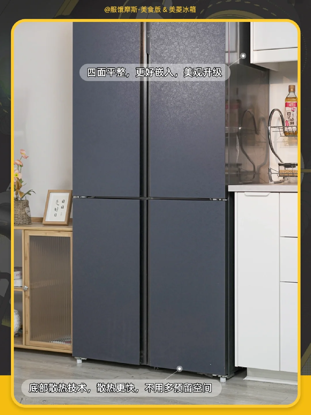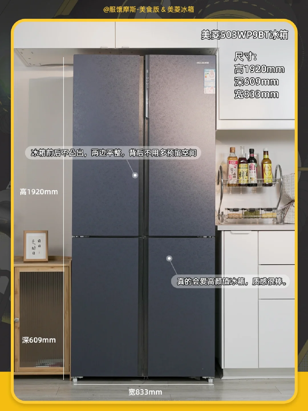 ☀️而且美菱503WP9BT冰箱是自由嵌入式冰箱,运用了底部散热技术,背部0距离贴墙放置空间,面部可和橱柜面齐平,直接提升厨房颜值。