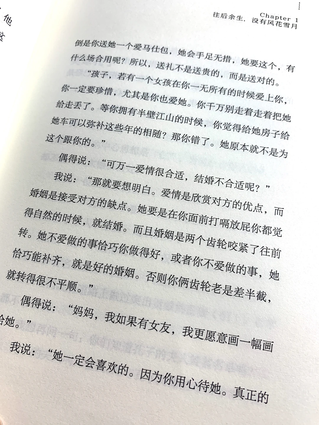 个人认为这本书的不足处呢,就是语言不够凝练(有延续写剧之嫌),事例和经历太浮于生活化和琐碎,大部分围绕着丈夫“秀才”和儿子“偶得”展开,看多了会乏味和疲倦,所传达的道理也是众所周知的生活经验,没有发人深省之处,留给读者的也就没有获知的满足感。