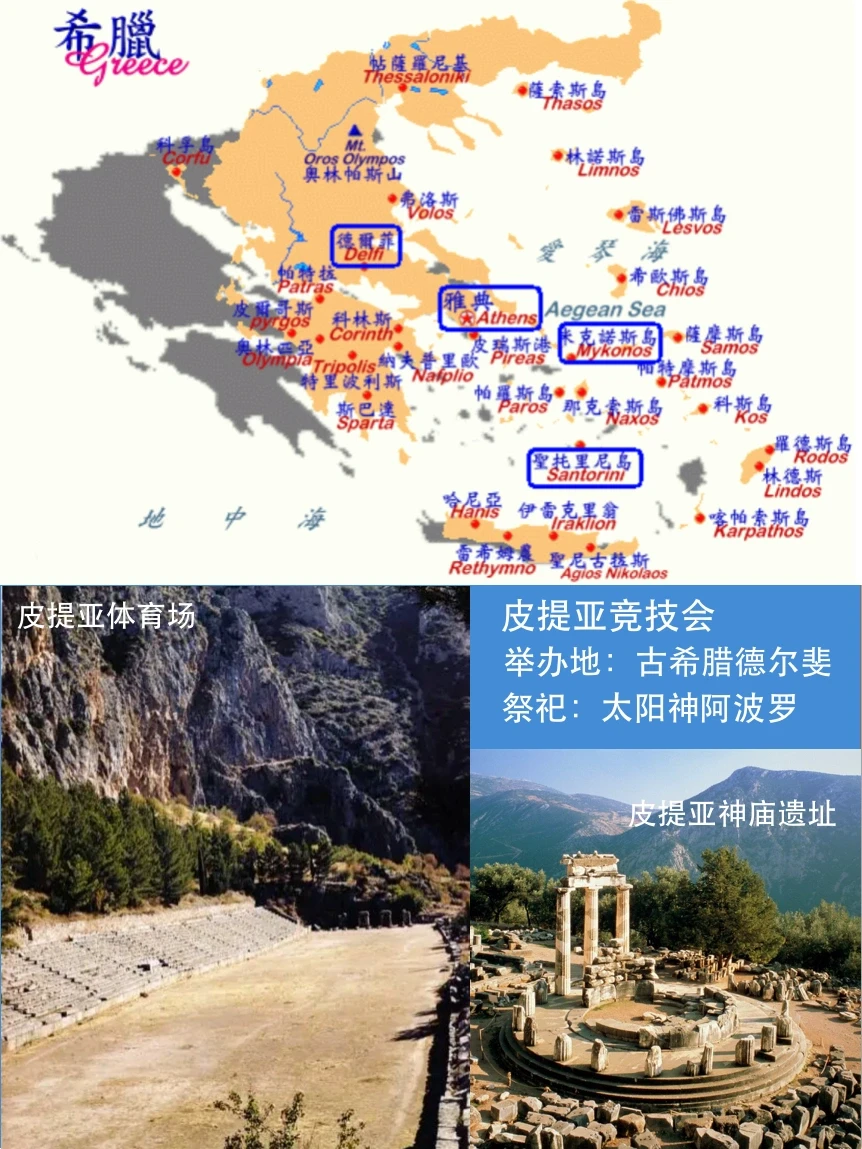 🌞皮提娅赛会的举办地是德尔斐,希腊人都会来这儿求阿波罗神谕,比如问我该不该搬家啊、出行啊之类的,有个皮提娅女祭司在神庙门口给他们解答,附近的体育场则会举办四年一度的竞赛。