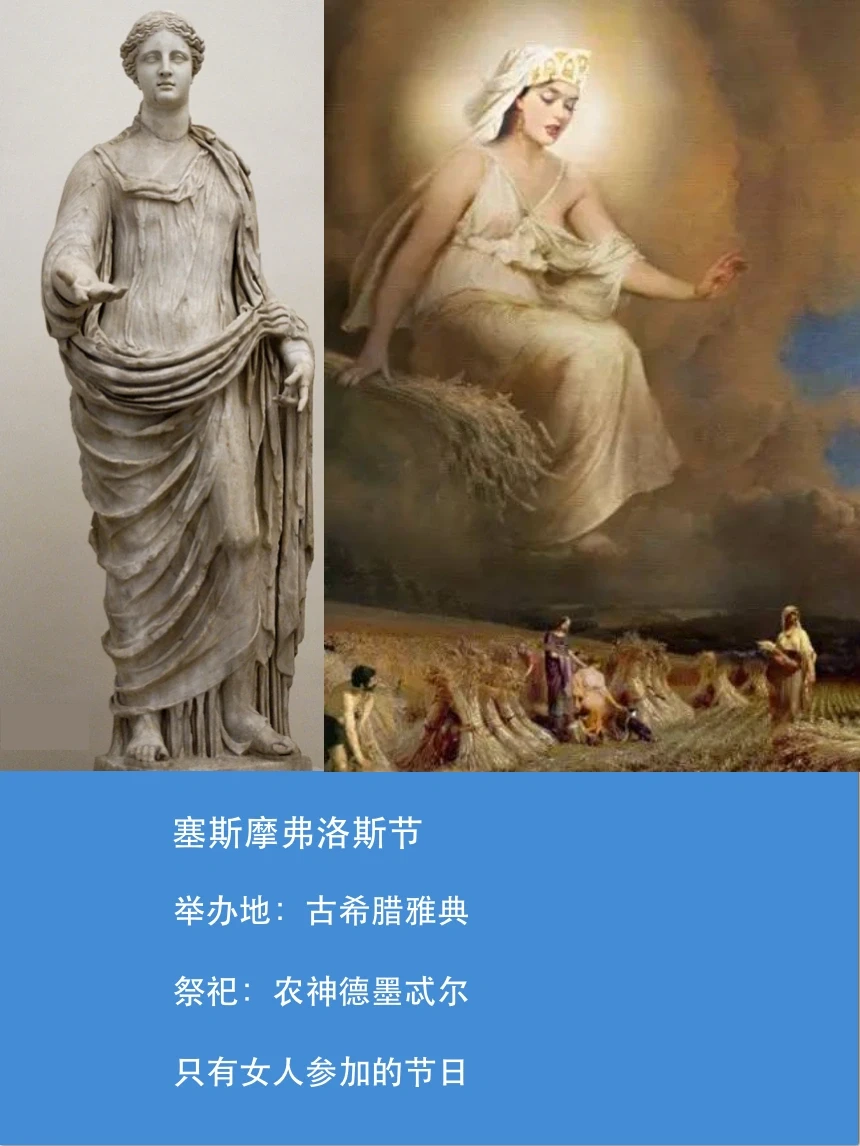 🌾但女人,也有自己的专属节日,而且因为繁衍都与农节相关,比如塞斯摩弗洛斯节,所有女人聚在一起,把像生殖器的物品埋起来。持续3天的节日中,她们随心所欲地骂男人,相传曾有男人因搅乱这一仪式而被咔嚓。