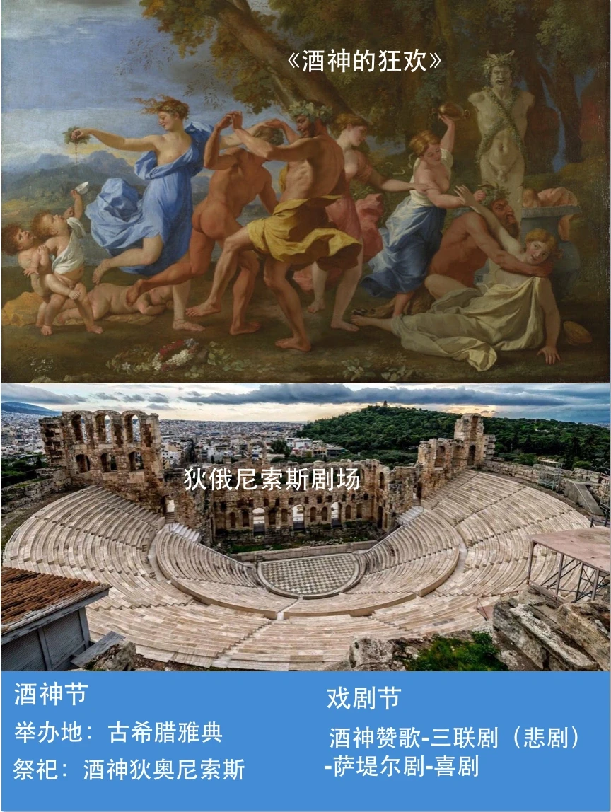 🎭哦,对了,酒神节还衍生出了戏剧节,当时的剧场能容纳14000名观众,1200名演员歌手,首先先来20首酒神赞歌,然后上演三联剧(悲剧),演完再来个萨堤尔剧,到了第四天,再开始演喜剧。那些最知名的悲剧家、喜剧家几乎都从这儿出名的。