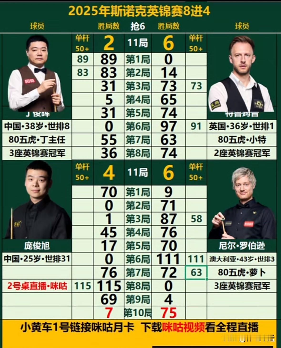 两场1/4决赛可太让人意难平了!丁俊晖和庞俊旭的表现看得人揪心。 丁俊晖开场2 - 0领先,状态挺好,第一局还轻松长台拼进。可谁能想到,之后被特鲁姆普六连鞭,最终2 - 6遗憾出局。特鲁姆普是80五虎里排名赛冠军最多的,虽然新赛季状态下滑,但这逆转能力还是强。 庞俊旭也是,1 - 0领先之后,被罗伯逊五连鞭拿到赛点。虽然后面连追三局,但还是4 - 6惜败。此前中国军团在第二轮3胜4负,八强占三席,可赵心童、吴宜泽等出局,夺冠希望本就降低,如今丁俊晖和庞俊旭也输了,实在可惜。 英锦赛 斯诺克赛程