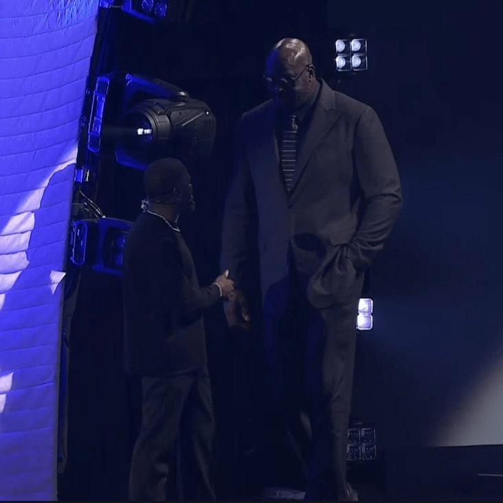 本场的主持人之一,美国喜剧演员、主持人,身高163cm的凯文-哈特在现场也和抽签嘉宾,前NBA巨星奥尼尔握手。