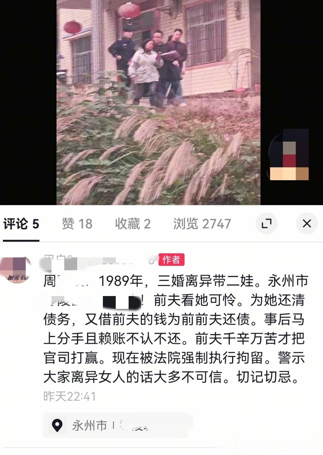 牛!有网友爆料称,湖南永州一名三婚离异带二娃的女子成了老赖!据该网友介绍,前夫为了让她的生活回到正规,为她还清了债务,结果她又借前夫的钱为前前夫还了债。事后马上分手且赖账不认不还。前夫只好将其告上了法庭,最终胜诉,老赖被逮走。 在没有确凿证据和全面了解的情况下,很难定义谁对谁错。或许她是一个重情义的人,念及过往情分愿意在对方困难时伸出援手,但前提是这笔钱一定是自己光明正大挣来的。只可惜她依然对婚姻抱有幻想,依然对曾经朝夕相处的男人存有依赖,依然想靠婚姻解决自己的债务问题。 婚姻不是慈善,也不是项目,它是两个独立灵魂的相互奔赴,是基于爱与尊重的平等盟约,需要用真诚浇灌、以责任守护,在岁月里共同生长,而非单方面的付出或功利的算计。很多人不明白一点,耽误了别人,毁了自己的婚姻。