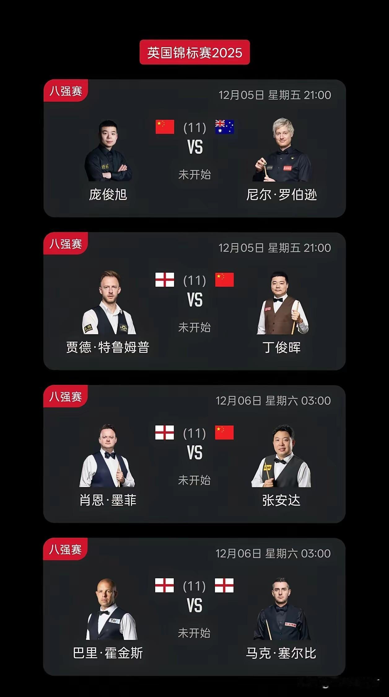 斯诺克英锦赛结束了三场1/4决赛,三位打入8强的中国球员全部输球出局。三届赛会冠军丁俊晖在2-0领先的情况下被贾德·特鲁姆普连赢6局,最终2-6失利,庞俊旭虽然顽强挽救三个赛点,仍以4-6不敌澳洲名将尼尔·罗伯逊,张安达3-6不敌世界冠军肖恩·墨菲,三人都无缘半决赛,最后一场马克·塞尔比与巴里·霍金斯的比赛正在进行中,胜者将获得最后一个四强席位。