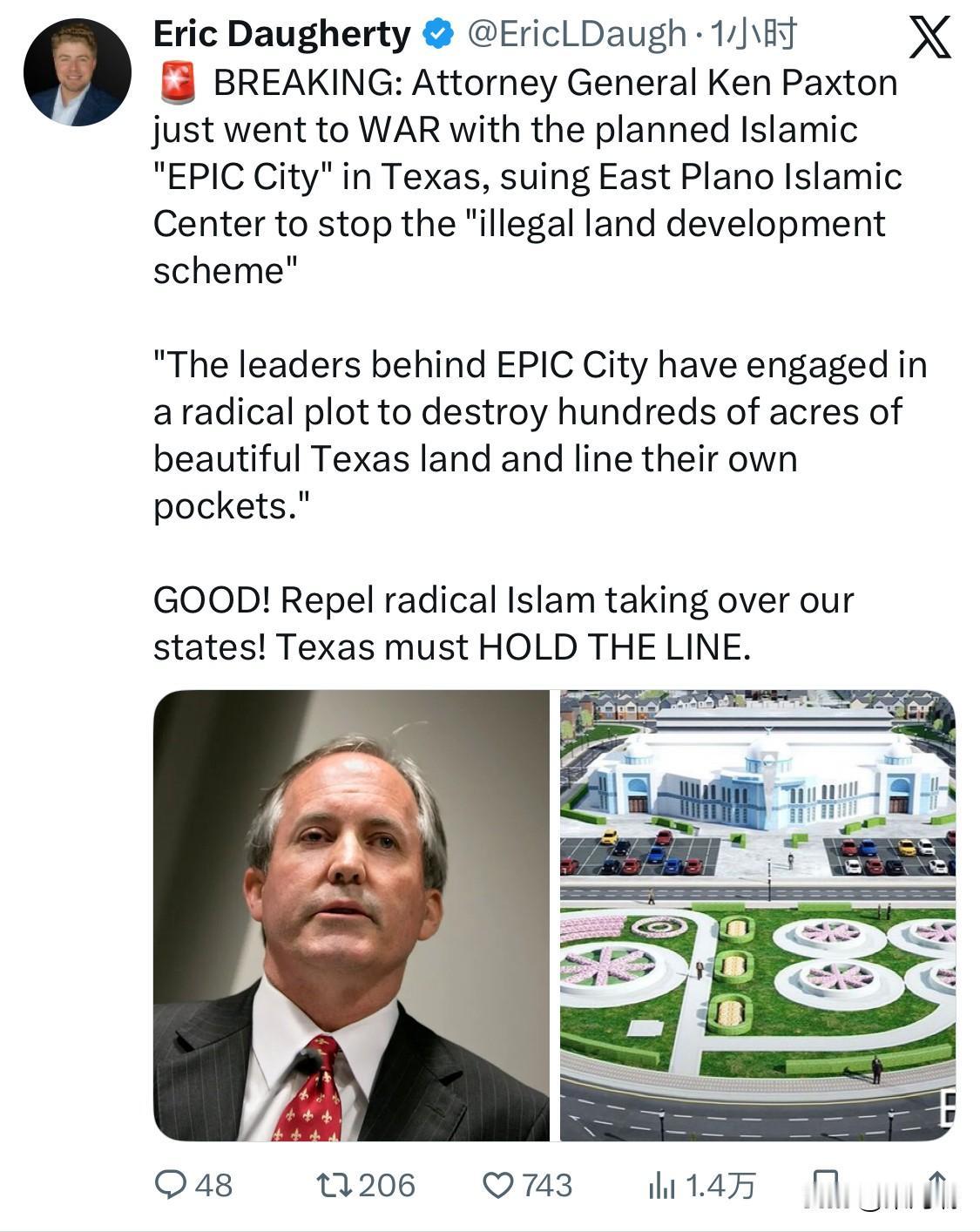 突发新闻:美国德克萨斯州总检察长肯·帕克斯顿(Ken Paxton)对计划在德克萨斯州建造的伊斯兰“史诗之城”(EPIC City)项目宣战,起诉东普莱诺伊斯兰中心,要求其停止“非法土地开发计划”。 “EPIC City背后的领导者们策划了一场激进的阴谋,企图摧毁数百英亩美丽的德克萨斯州土地,中饱私囊。” 好!击退企图控制我们各州的极端伊斯兰势力!德克萨斯州必须坚守阵地。