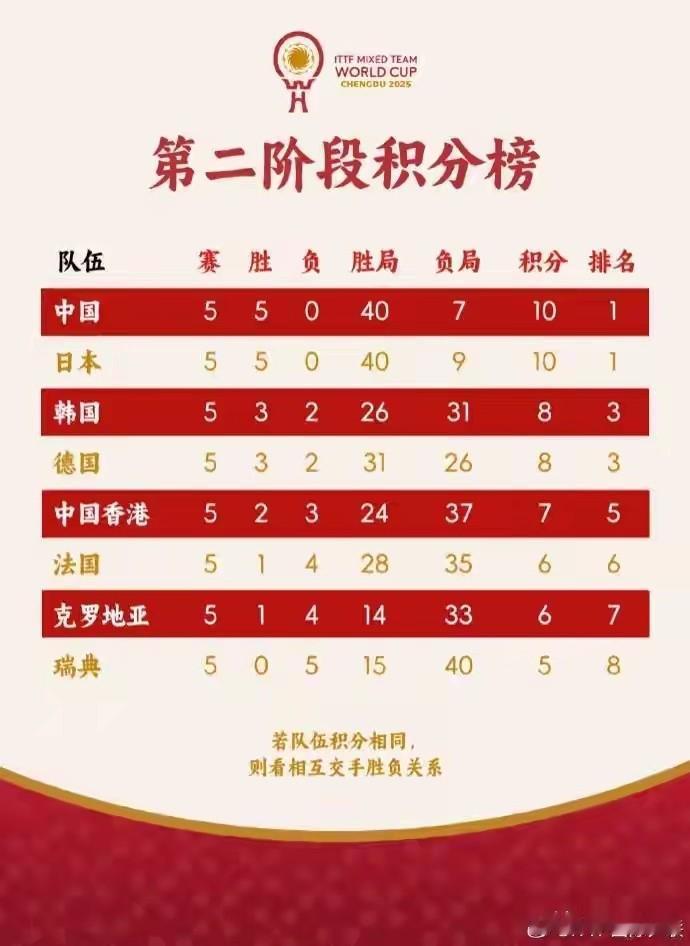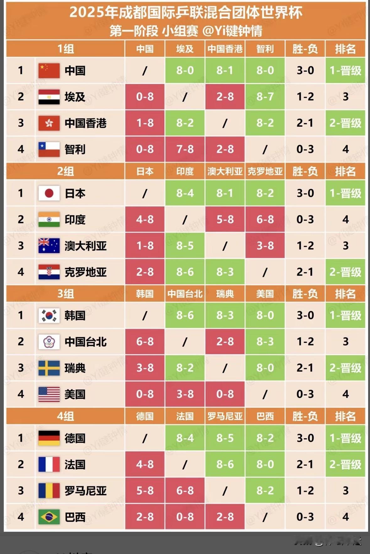 🎉🎉2025年成都混合团体世界杯,卫冕冠军国乒战绩最佳🔥🔥 小组赛第二轮赛果各有看点,德国队8-4胜法国队,罗马尼亚队8-2胜巴西队,韩国队8-6胜宝岛队。而国乒更是表现出色,12月5日以8比4击败德国队,提前晋级四强! 比赛有稳赢的场次,也有惊险瞬间。王楚钦男单首败,被弗朗西斯卡2比1拿下,但现场掌声不断,球迷一直为他打气。此前对法国队时,梁靖崑浪费赛点输掉单打,不过团队协作还是8比1获胜。混双“动漫组合”林诗栋和蒯曼先胜两局,第三局被对手扳回一局。孙颖莎女单发挥稳定,连赢三局。 国乒目标明确,就是冲冠军! 国乒成都混团 混团世界杯 国乒混团赛 成都双混世界杯 成都混团乒乓球