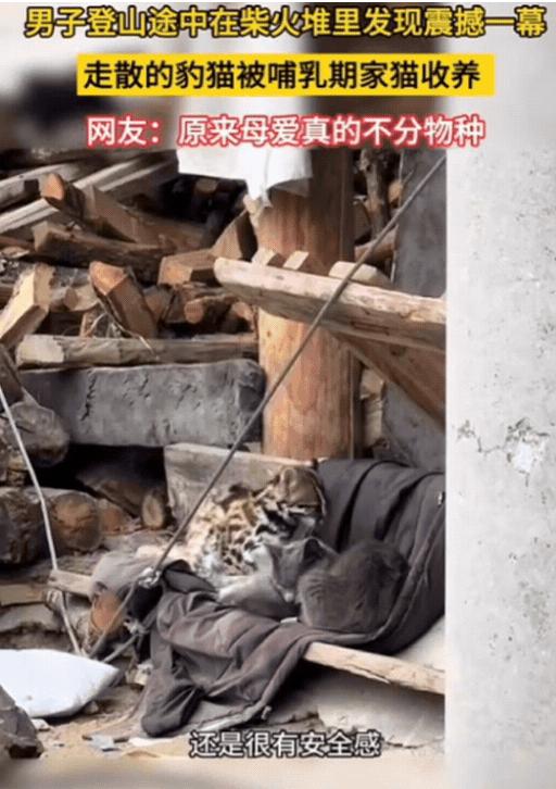 “太神奇了!”四川凉山,一男子爬山时路过一户农家,无意间往柴火堆里瞥了一眼,发现几只小猫窝在一块儿。本来以为就是普通的小土猫,可细看之下,其中一只的花纹特别不一样,身上带着类似豹子的斑点,眼神也格外野性。男子心里一动,掏出手机查了查,结果吓了一跳:这可不是家猫,而是国家二级保护动物豹猫。 2025年12月2日,四川凉山的山林间藏着一段特别的故事,被一位登山的男子偶然撞见后,迅速温暖了网络。 当时他沿着山路行走,途经一户散落在山间的农家,院墙边一堆由松针和枯枝垒起的柴火堆引起了他的注意。 里面隐约有细碎的响动,他起初以为是偷藏的田鼠,走近俯身查看,才发现是一窝蜷缩的小家伙。 那堆柴火被晒得干燥蓬松,成了天然的保暖窝,一只灰色的成年母猫蜷在中央,四只小猫正围着它亲昵地拱动,显然是在哺乳。 山里农户大多会养猫护院,男子本想转身离开,目光却被其中一只小猫勾住了。 三只幼崽都是灰白斑纹,和猫妈妈长得如出一辙,唯有最外侧那只,毛色是淡淡的土黄,布满了一圈圈铜钱大小的黑斑,眼神也透着股机灵劲儿,丝毫不见寻常幼猫的怯懦。 这奇特的花纹让他起了疑心,立刻掏出手机检索比对,结果让他颇为吃惊,这竟是国家二级保护动物豹猫的幼崽。 他站在原地静静观察了许久,大致拼凑出了事情的脉络,这只小豹猫应该是在山林中跟随母亲活动时走散,慌乱中误闯到农家附近,恰好遇到了这只正处于哺乳期的母猫,被当作了自己的孩子收留。 母猫对这只“外来者”的态度,更让人动容。 察觉到有人靠近,它立刻抬起头发出一声轻唤,身体微微收紧,将四只幼崽都拢进怀里,那只豹猫崽被稳稳护在中间,位置比自家孩子还要靠里。 哺乳结束后,母猫开始给幼崽们舔毛,它先是把豹猫崽拉到身前,用舌头仔细梳理它背上的斑纹,直到毛发变得顺滑光亮,才转而照料另外三只亲生幼崽,连它们肉垫间的细缝都梳理得干干净净。 小豹猫也全然不认生,有时挤不进吃奶的圈子,就用脑袋轻轻蹭母猫的脸颊,喉咙里发出满足的咕噜声,和其他幼崽的亲昵模样毫无二致。 这段画面被传到网上后,网友们的评论里满是暖意。 有人说“原来母爱真的不分物种”,也有人感慨“这只小豹猫也太幸运了,迷路了还能遇上这么好的猫妈妈”。 确实,对小豹猫来说,这场意外的相遇就是天大的幸运,若不是遇上这只心善的家猫妈妈,在寒冷的山里很难熬过多久。 而家猫妈妈的举动,更让人看到了最纯粹的善意,它不懂什么是保护动物,也不知道“非我族类”的说法,只看到一只瑟瑟发抖的幼崽,就本能地伸出了援手。 这些小动物的相处,总能让人触摸到生命最本真的爱护。 这种爱护不掺杂任何功利,纯粹源于内心的本能,比人类世界里许多复杂的情感更能打动人心。 母猫的世界很简单,没有物种的界限,只有“需要呵护的孩子”,这份不加分辨的守护,正是最动人的地方。 但这份温暖的相遇,从一开始就注定会有别离。 网友们在感动之余,也纷纷关心这只豹猫崽最终的去向,疑问最多的便是“它还能回到山林里吗”。 豹猫本就属于野外的生灵,成年后体长能达到一米左右,靠着捕食竹鼠、斑鸠等小型动物生存,是山林中独来独往的捕猎者。 要是长期待在农家小院,习惯了人类提供的食物,它的野外生存技能会逐渐退化,最终失去在山林中立足的能力,这对它的长远生存并无益处。 发现情况后,男子已经联系了当地林业站,接下来会由专业人员判断小豹猫的身体状况,等它再强壮些,经过野化训练后,就会被送回真正属于它的山林。 对小豹猫来说,和家猫妈妈的这段缘分是生命里的一段温暖插曲,而回归自然,才是它最好的归宿。 虽然注定要分离,但这段跨越物种的母爱,已经成了凉山山里最温暖的一段小故事。