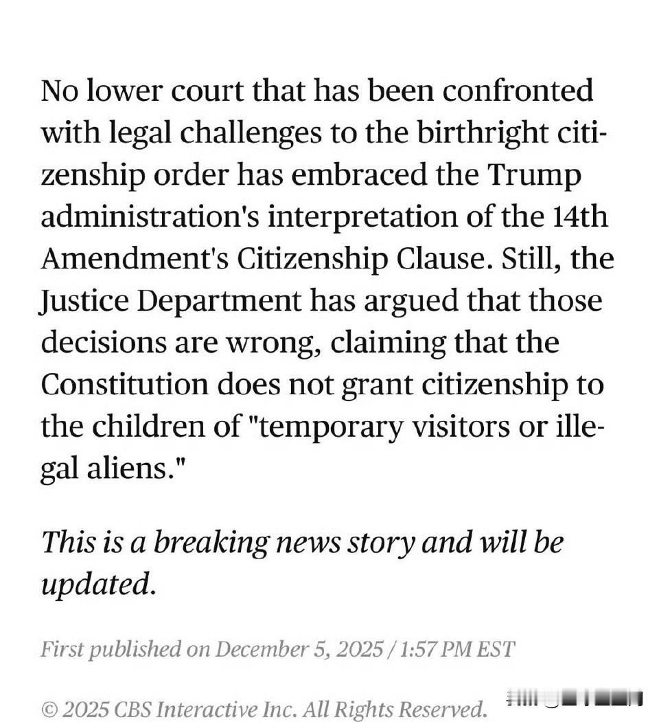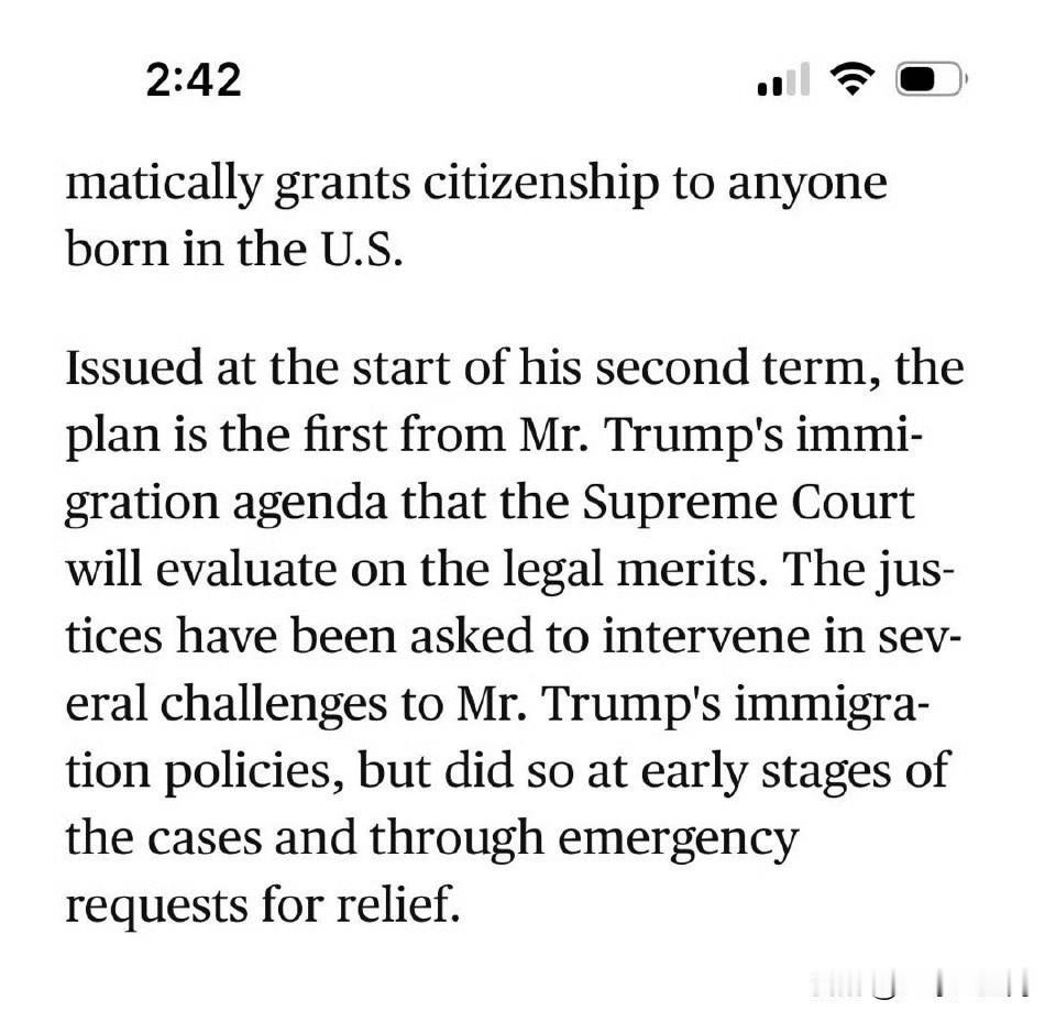最高法院同意决定川普终止与生俱来的公民身份计划的合宪性。 华盛顿——最高法院周五表示,它将决定川普总统寻求终止与生俱来的公民身份的行政命令的合法性,该命令自动授予任何在美国出生的人公民身份。 该计划在川普的第二个任期开始时发布,是川普移民议程中的第一个,最高法院将根据法律是非曲直进行评估。法官们被要求对川普移民政策的几项挑战进行干预,但在案件的早期阶段通过紧急救济请求这样做了。 没有一个下级法院面对过对与生俱来的公民身份命令的法律挑战,没有接受川普政府对第14修正案公民身份条款的解释。尽管如此,司法部仍认为这些决定是错误的,声称宪法不授予“临时访客或非法移民”的子女公民身份。 这是一个突发新闻,将更新。