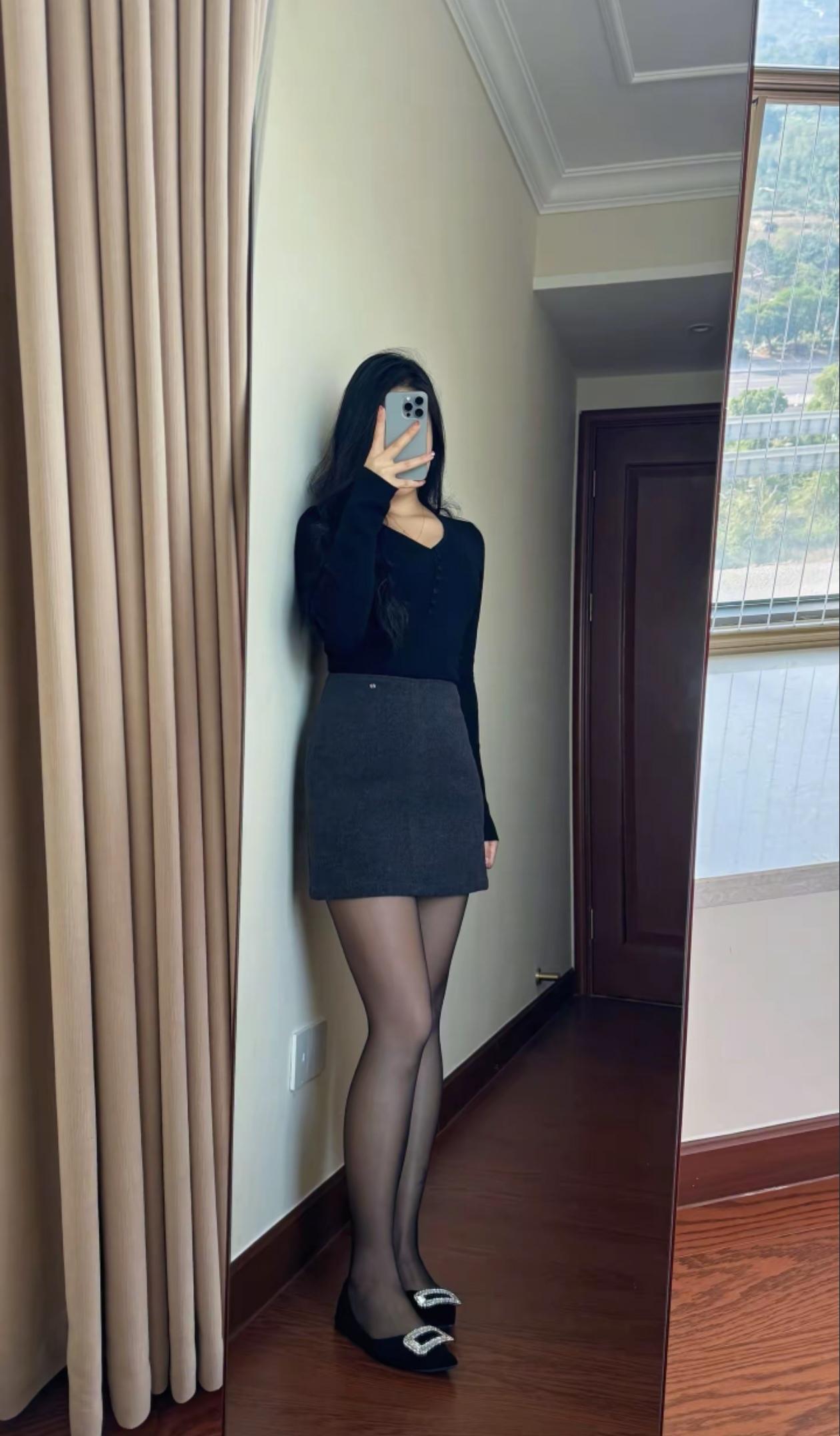 穿着黑色上衣和灰色短裙,搭配黑色丝袜和鞋子。