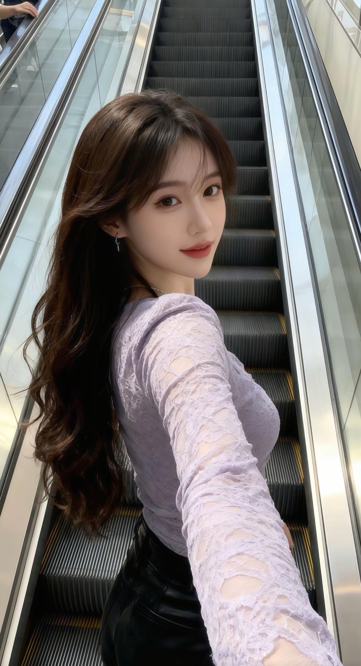 电梯自拍,紫色蕾丝上衣搭配黑色牛仔裤,优雅气质满满!💄👗👠
