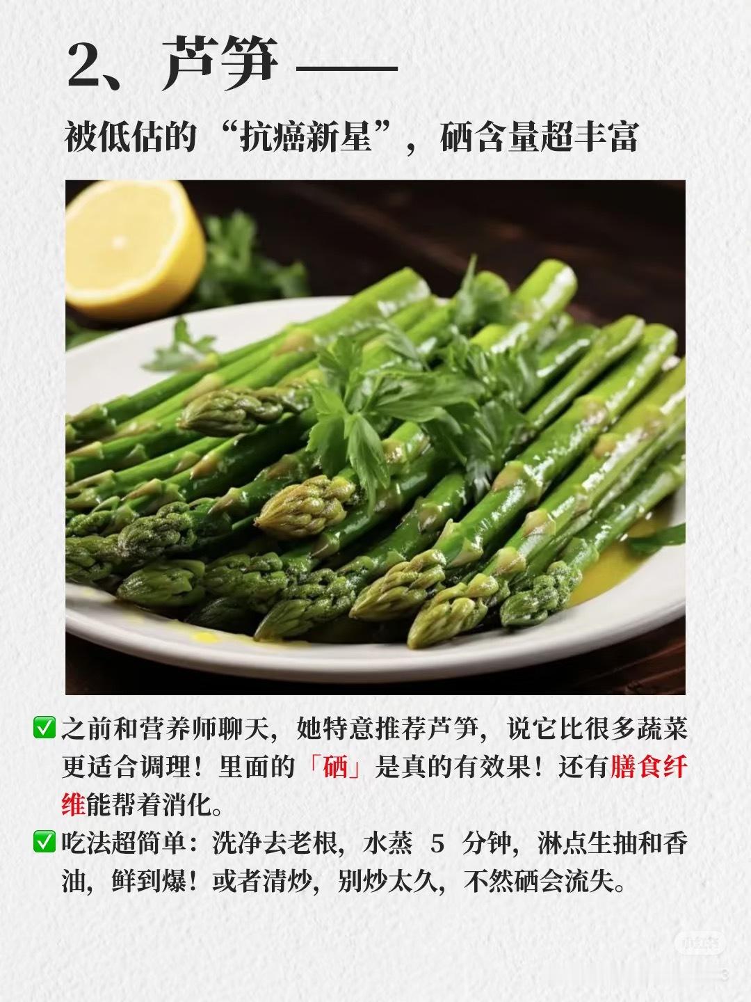 5种食物被认为是抗癌明星🌿 蔬菜篇1、西兰花:这是抗肿瘤界的“扛把子”!西兰花含有丰富的萝卜硫素,能帮助身体排出致癌物,还能增强免疫力。每次吃一小碗,就能收获满满的健康。2、胡萝卜:胡萝卜素的“宝藏”,它能转化成维生素A,对眼睛和免疫力超有好处。而且胡萝卜里的抗氧化成分,能帮我们抵御自由基,预防肿瘤。3、大蒜:别小看这颗小小的蒜,它里面的蒜素能抑制癌细胞生长,还能杀菌。每天吃一两瓣,身体棒棒哒!🍇 水果篇1、蓝莓:抗氧化界的“天花板”,富含花青素,能保护细胞不受损伤,还能改善视力。每天吃一小把,健康又美味!2、草莓:不仅颜值高,营养也超丰富。它含有丰富的维生素C和抗氧化剂,能增强免疫力,预防癌症。3、猕猴桃:维C含量超高,比橙子还厉害!它能帮助身体抗氧化,还能促进消化,一举多得。🌰 坚果篇1、杏仁:富含维生素E和膳食纤维,能抗氧化,还能降低胆固醇,对心血管超友好。2、核桃:大脑的“加油站”,富含欧米伽-3脂肪酸,能保护神经,还能预防肿瘤。3、腰果:口感超棒,富含镁和锌,能增强免疫力,还能调节血糖。🍲 其他篇1、绿茶:茶多酚含量超高,抗氧化能力超强,还能提神醒脑。每天喝一杯,健康又清爽。2、番茄:富含番茄红素,能抗氧化,预防前列腺癌等多种癌症。生吃、熟吃都超棒!5种食物被认为是抗癌明星