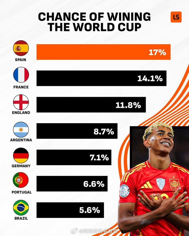 西班牙成世界杯夺冠最大热门 17%——根据Opta预测,卫冕欧洲杯冠军🇪🇸西班牙是2026年世界杯的夺冠热门(17%),他们有望成为历史上第一个第二次同时赢得欧洲杯和世界杯冠军的国家(此前曾于2008年、2010年和2012年实现过这一壮举)。法国英格兰分列二三名