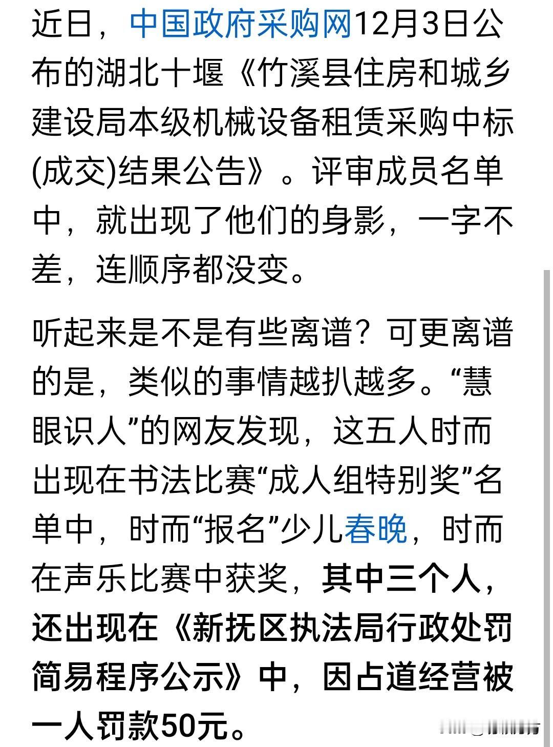 “最忙五人组”,这应该是近期最有冲击力的国内新闻了吧,这五个人名时而是招标评审,时而书法获奖,时而声乐获奖,又会因占道经营而被处罚。我们在感叹他们肆无忌惮,旁若无人的同时,会不会想到又有多少名单是费了心思向壁虚构的呢?防不胜防啊。 是该问下是谁成就了“最忙五人组”,但由谁来问,结果也会有很大不同吧?[捂脸]中国最忙五人组 全国最忙五人组 最忙五人组