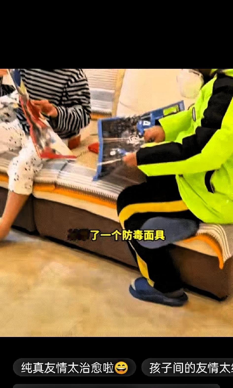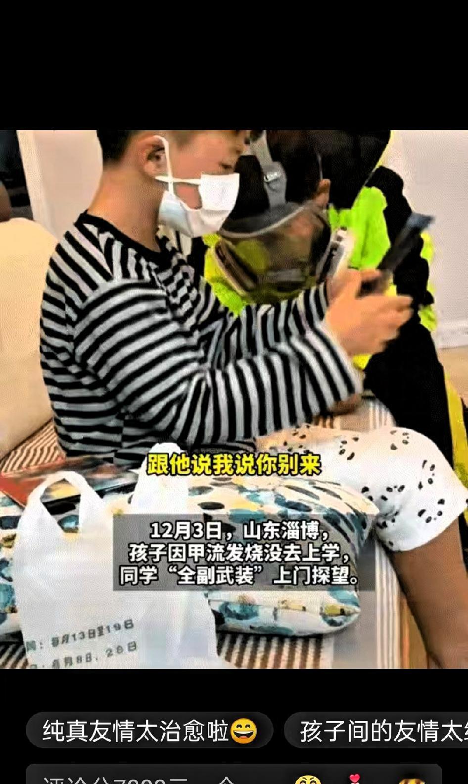 万万没想到!山东,一小男孩因为流感发烧没去上学,在家休养时,打电话和同学说自己烧的难受,有点想他了 没料到同学记在心里,当即就想着上门探望。 男孩妈妈担心流感传染,特意劝阻,可同学格外认真,说自己戴好防护就没事。等妈妈出门接人,果然见孩子戴着防毒面具,手里还拎着退烧药、水果,外加一本小男孩喜欢的课外书,把关心都装在了这些小物件里。 见到同学来,原本没精神的小男孩一下子开心起来,直言感觉病都好了一半,拉着同学坐在一起聊天玩耍。 两个孩子平时同班,常一起打球,感情本就要好,这份惦记没有半点复杂心思,只因为一句想念,就想着当面陪伴。 防毒面具看着有些特别,却是孩子能想到的最稳妥的办法,既没耽误见朋友的心意,也考虑到了健康防护,这份纯粹里藏着最真切的在意。 更难得的是家长的态度,没有因为怕传染就阻止孩子的善意,反而支持这份简单的牵挂,既保护了孩子,也传递了温暖的心意。 成年人的社交常掺着权衡,可孩子的友情从不含杂质,不用刻意维系,不用计较得失,一份主动的关心,一次坚定的奔赴,就是最动人的模样。 其实友情本该如此,不分形式,重在真心,哪怕有小阻碍,也愿意为对方多考虑一点、多付出一点。这份直白又真诚的情谊,不仅治愈了生病的小男孩,也让我们看到了友情最本真的美好,简单却有力量。