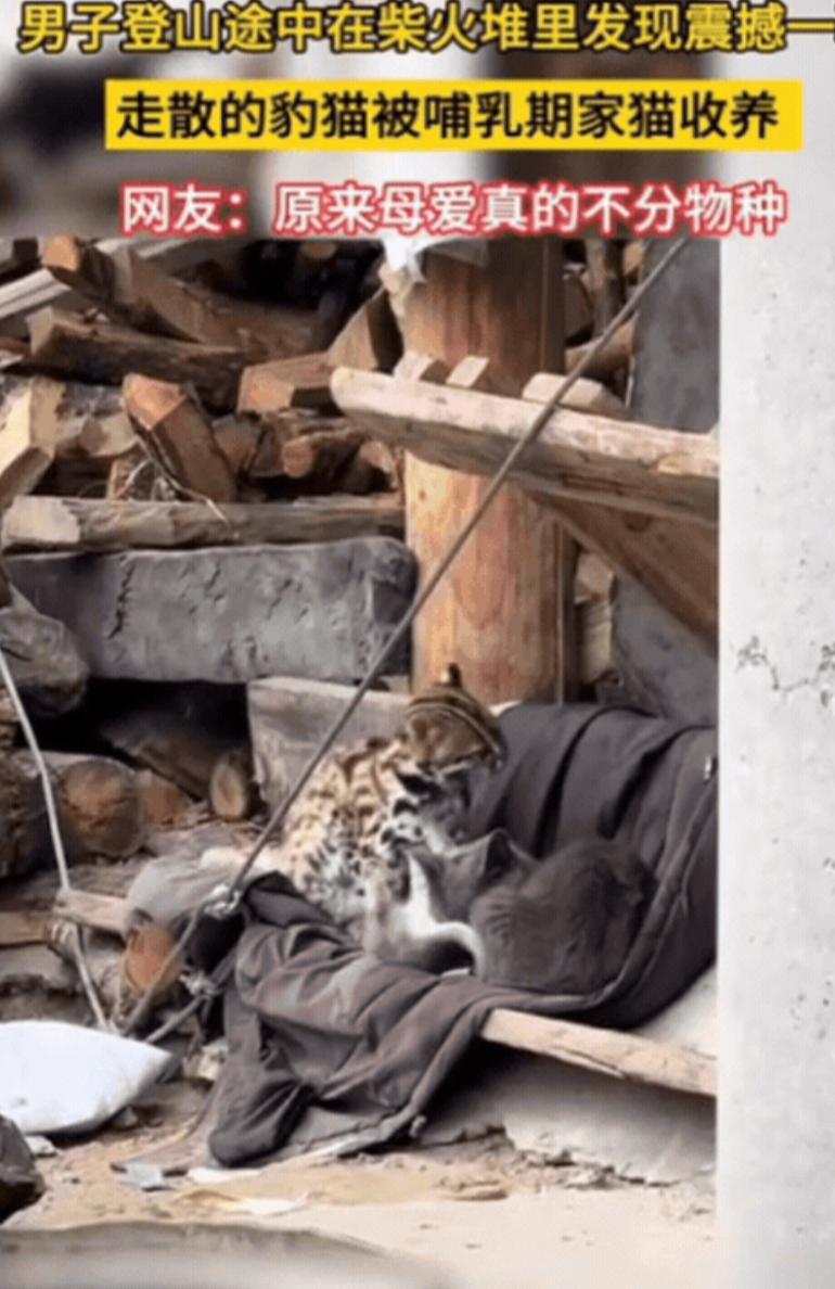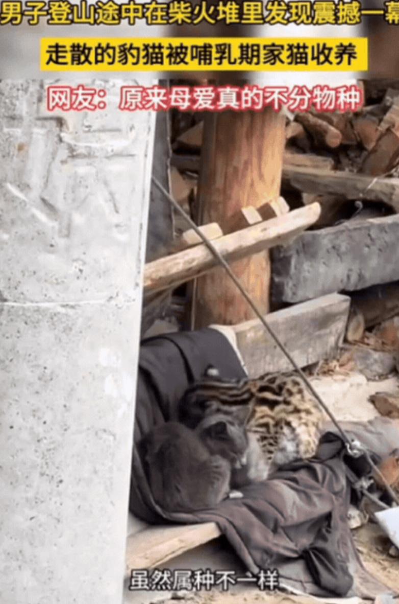 太有灵性了!四川一男子爬山途中,竟然在农户柴火堆里,发现震撼一幕,一只豹纹的小猫,和几只家猫待在一起,男子认出这是一只走散的豹猫,将母家猫当成了自己妈妈,虽然双方属种不一样,但是豹猫和母猫在一起,还是很有安全感,网友:原来母爱真的不分物种! 在四川凉山的深山里,藏着太多意想不到的惊喜与温情。那天一位小伙本来只是趁着空闲去山里爬山散心,沿着蜿蜒的山路慢悠悠往前走,路过一户农家后院时,无意间往墙角的柴火堆扫了一眼,这一看,直接撞见了让他既震撼又心头一暖的一幕,事后回想起来还忍不住直呼 “太有灵性了”。 起初小伙还以为柴火堆蓬松的松针和干柴里,窝着一窝灰扑扑的大老鼠,毕竟那堆枯枝败叶看着就很适合小动物藏身,可他脚步稍一放缓,定睛仔细瞧过去,才发现是自己看错了,那根本不是老鼠,而是一窝正挤在一起吃奶的小猫崽。 这窝小猫崽的 “画风” 却透着股诡异的和谐,一只大灰猫正温顺地侧躺在柴草上,肚皮朝下,三只灰白花色的小家猫正埋着头在它怀里拱来拱去,贪婪地吮吸着奶水,一看就是大灰猫的亲骨肉。 可在这三只小家猫中间,却混着一个 “大个头”,它的皮毛和周围的兄弟姐妹截然不同,浅黄的底色上,整整齐齐印着一圈圈铜钱大小的黑斑点,在一堆灰白绒毛里格外显眼。 小伙心里 “咯噔” 一下,这花纹可不是村里常见的家猫碎芝麻斑啊!他赶紧掏出手机对着比对,越看越心惊,这小家伙眼神里带着点与生俱来的冷冽,身形也比旁边的家猫崽壮实一圈,分明就是咱国家的二级保护动物豹猫,也就是山里人常说的 “山猫子”! 他悄悄凑近了些生怕惊扰到这窝小家伙,这才看清了更暖心的画面,这只本该在山林里跟着亲妈闯荡的小豹猫,显然是不小心和族群走散了,误打误撞跑到了农户的柴火堆,把这只刚生产不久的家猫当成了自己的妈妈。 它一点没显出山林猛兽幼崽的野性,反而和家猫崽们挤在一起,拼命往大灰猫肚子底下钻,就为了抢个舒服的奶头,偶尔抢不到的时候,它还会用带着漂亮豹纹的小脑袋,轻轻蹭一蹭家猫妈妈的下巴,喉咙里发出只有家养小猫才会有的软糯 “咕噜” 声,那模样温顺又依赖,看得出来,在这位 “养母” 身边,它打心底里觉得踏实又有安全感。 小伙后来回忆起这一幕,还忍不住感慨,谁能想到成年后能长到三尺多长、专在夜里捕猎斑鸠竹鼠的山林独行杀手,小时候会这么黏人,而最让人动容的,还是那只毫不知情的家猫妈妈。 在它眼里大概根本没有 “物种隔离” 这回事,也不知道自己怀里这个花纹特别的小家伙,是和自己完全不同的保护动物,或许是刚生产完母性泛滥,又或许是瞧着这只小豹猫孤零零的实在可怜,它不仅没半点排斥,反而对这个 “外来娃” 和自己的亲骨肉一视同仁。 它会耐心地用舌头一遍遍舔舐小豹猫背上的铜钱斑纹,从脑袋到尾巴尖,连爪子缝里的灰尘都不放过,直舔得那身豹纹油光发亮,它还会因为小豹猫个头大、吃得多,特意把最饱满的奶头留给它,甚至有风吹动柴草发出声响时,它会第一时间把身体往小豹猫那边挪一挪,用自己的身子护住这个捡来的孩子。 这一幕被小伙拍下来发到网上后很快就火了,网友们纷纷留言:“原来母爱真的不分物种”“这只家猫妈妈太伟大了”“小豹猫也太有灵性了,知道找个靠谱的妈妈”,大家一边为这份跨越物种的温情感动,一边也在操心小家伙的未来。 毕竟感动归感动,现实里的考量也不能少,要是小豹猫长期依赖家猫妈妈的庇护和人类周边的环境,慢慢就会丧失野外捕猎的本能,到时候就算长得再威风,也成了没能力独自生存的 “废猫”。 好在小伙没只顾着围观拍照,他第一时间联系了当地的林业站,工作人员赶到后,小心翼翼地把小豹猫接走,计划等它具备独立生存能力后再放归山林。 把属于山野的生命还给山野,才是对这份奇妙缘分最负责任的守护,而那堆柴火堆里的温情,却成了所有人心里的一道光,让我们知道在大自然里,母爱可以冲破物种的界限,而生命与生命之间的联结,也能这么纯粹又动人。