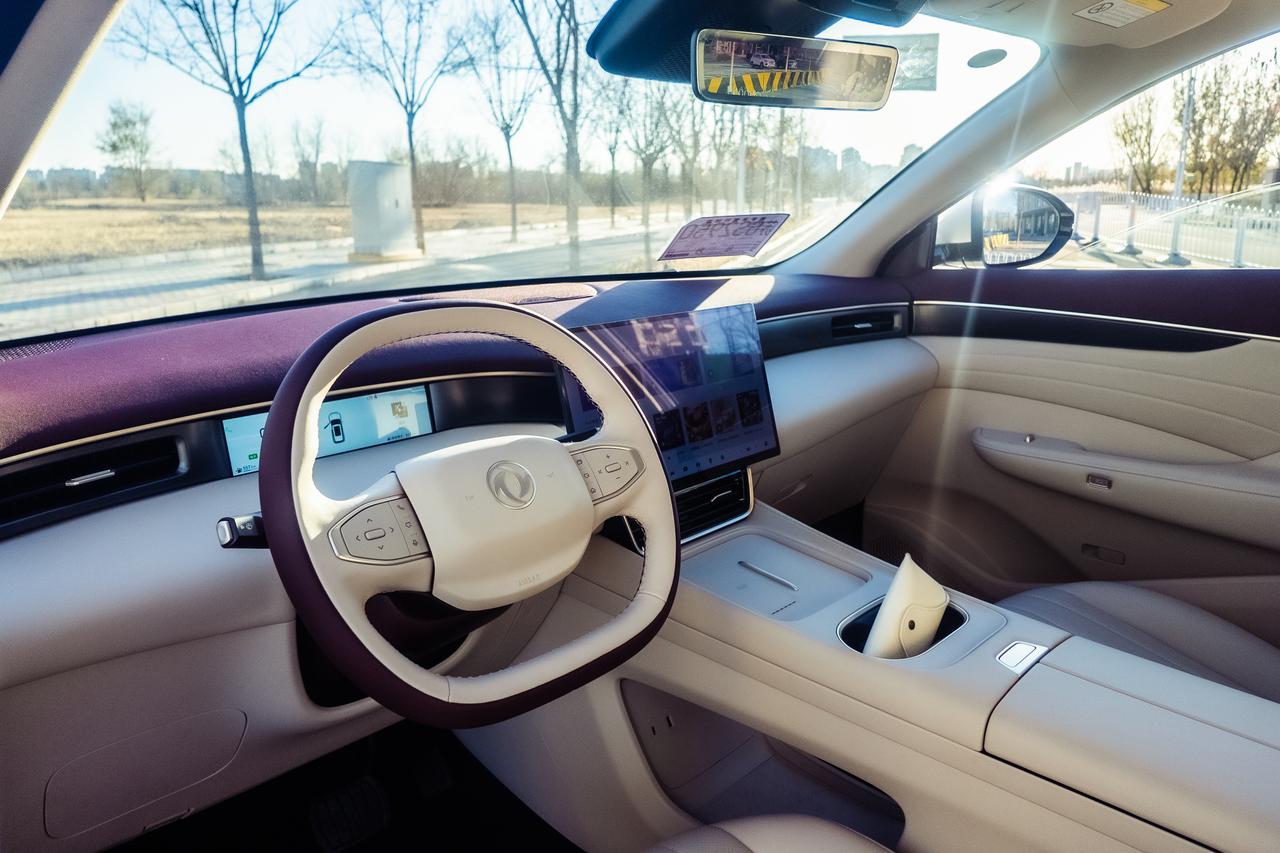 试驾体验东风风神L8,外观造型更简洁,还是一贯的运动风格流线造型,现在的消费者应该更喜欢更高的车身,溜背造型会压缩车内空间。 这款车后排的舒适配置给了很多,有后排吸顶屏、后排小桌板、后排冷暖箱,后排座椅的靠背角度也可以调节。 前排造型设计整体简洁,是目前主流新能源车型的设计,中控台使用复合材料,手感柔软。深紫和米色的配色也很时尚优雅。【来自懂车帝车友圈】