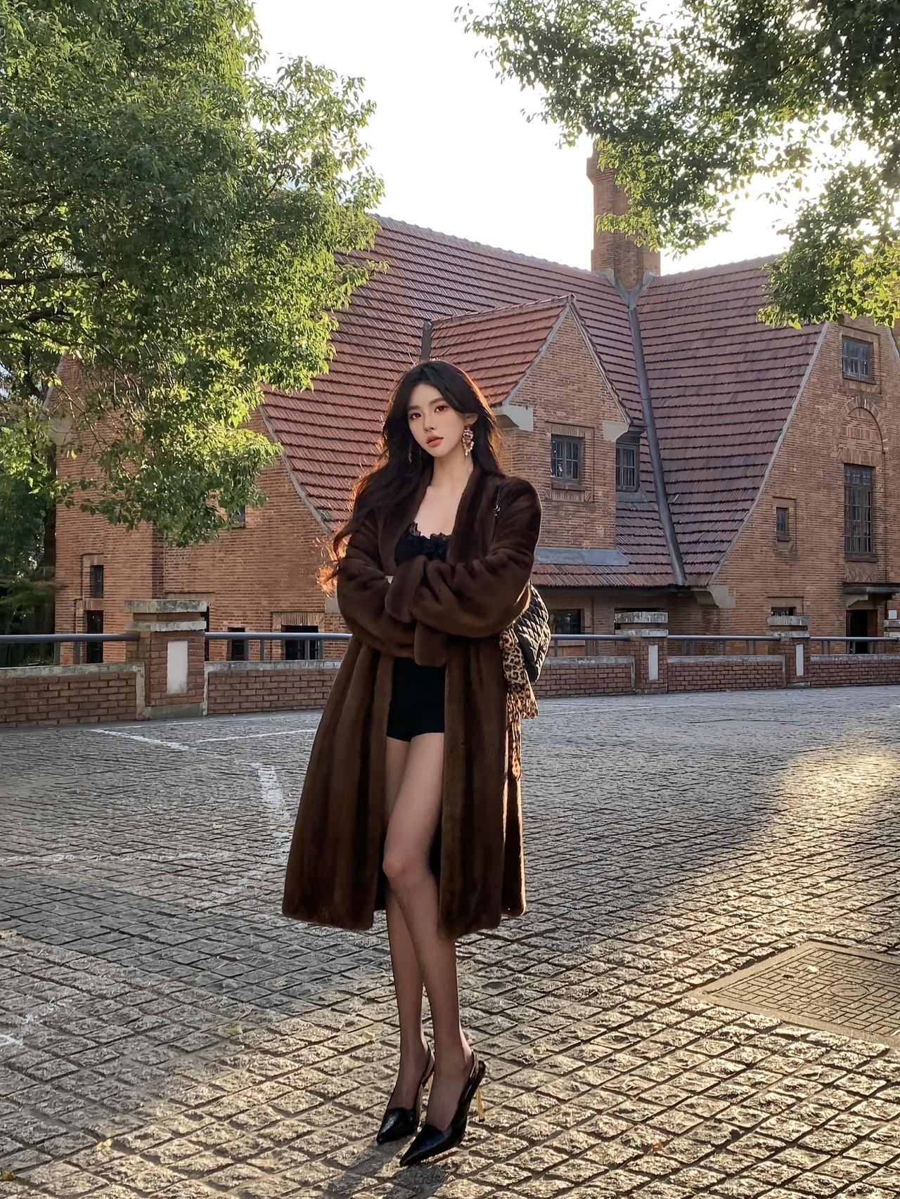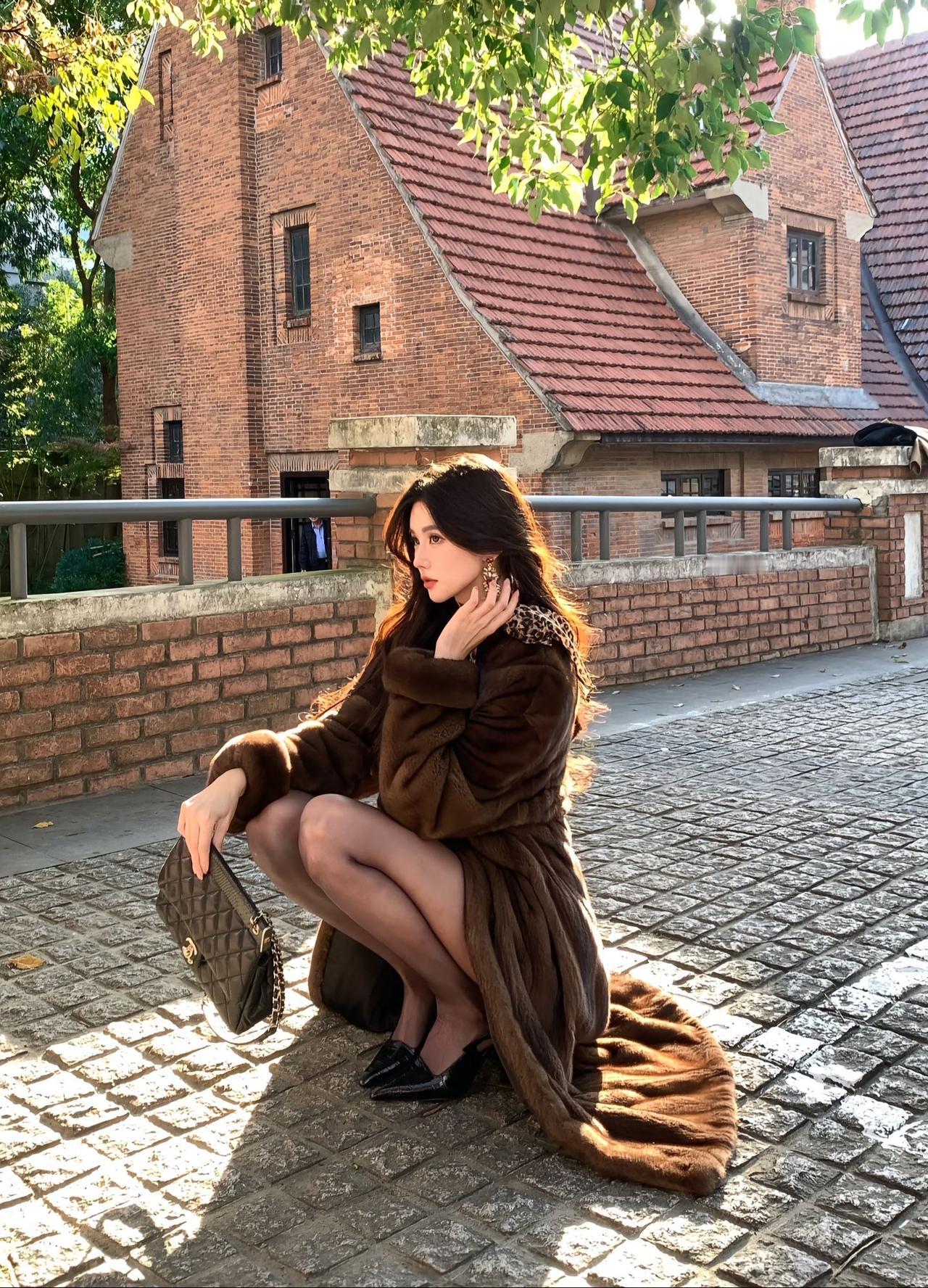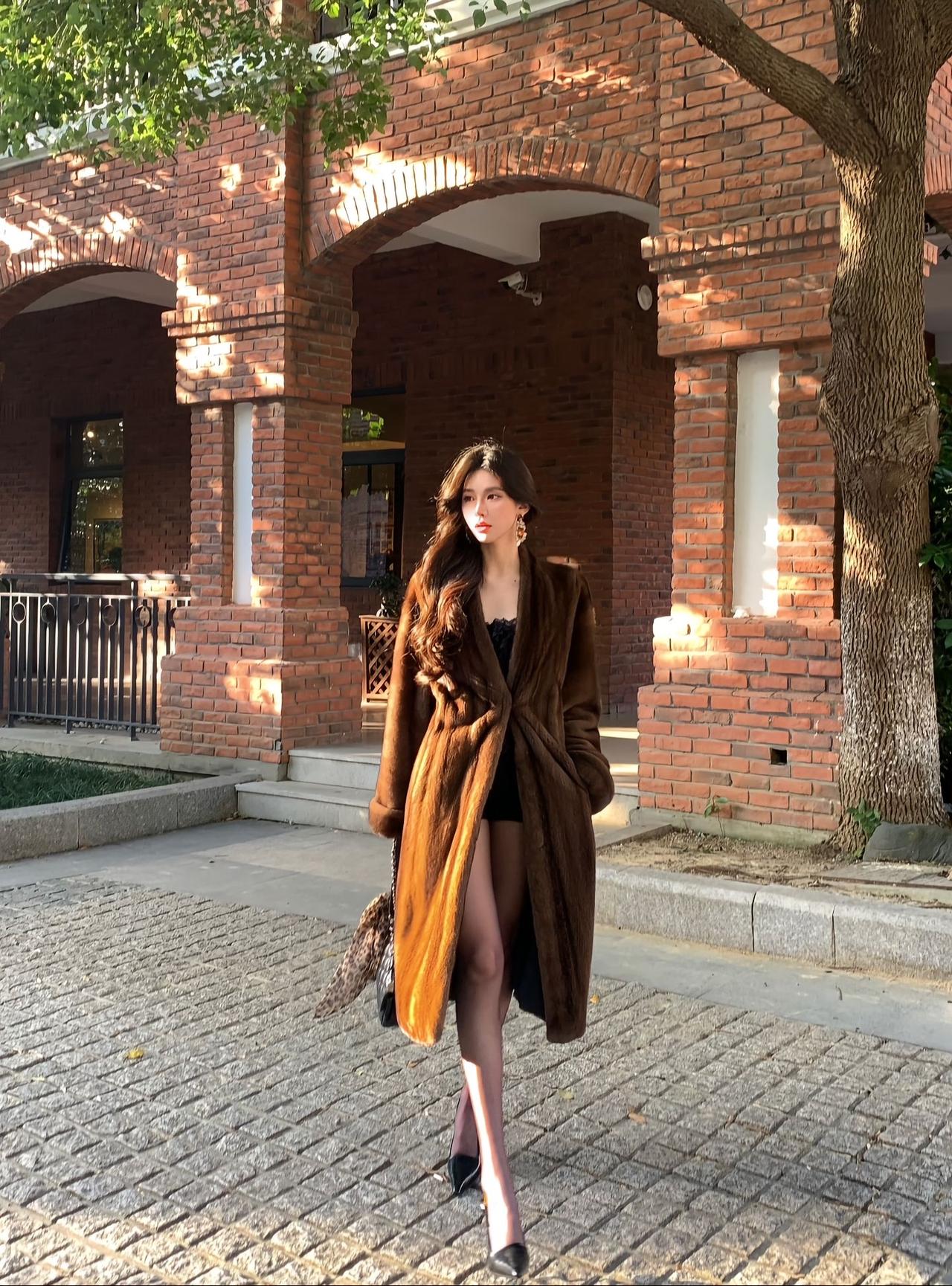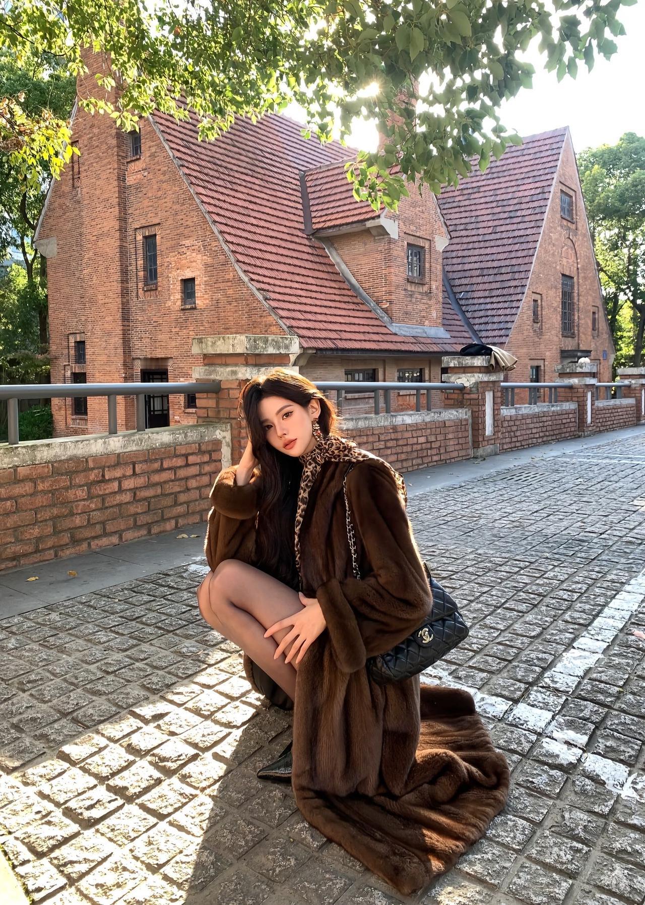 秋日街头的“贵气御姐”:一件皮草大衣,穿出不费力的高级感 秋日午后的红砖老建筑