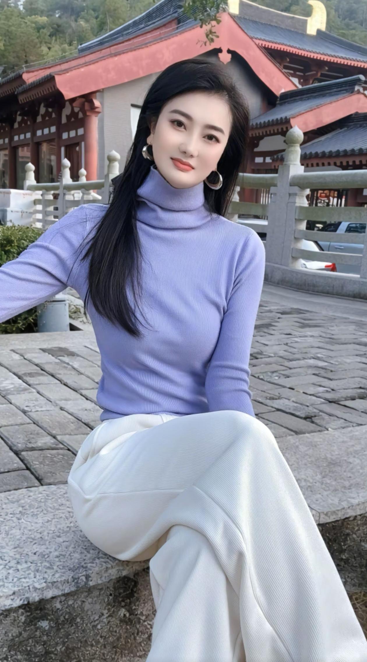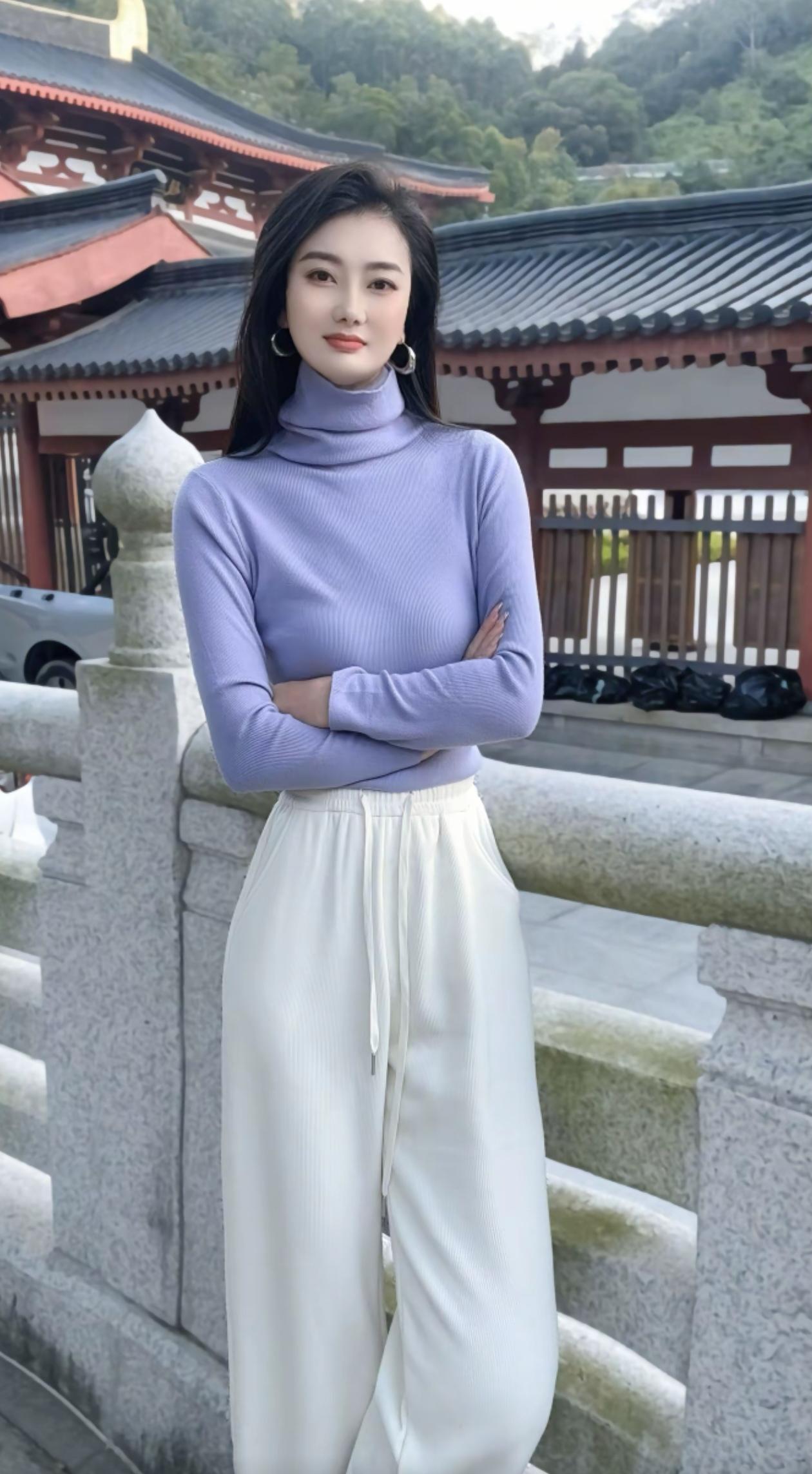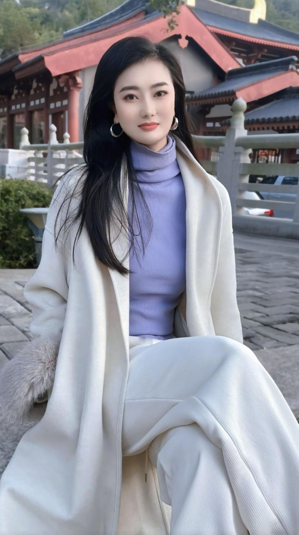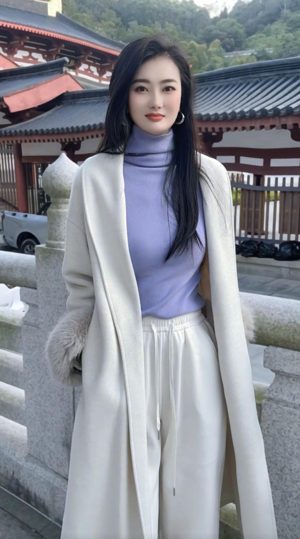 秋日穿搭指南:紫色高领毛衣+米色大衣,温暖又时尚!