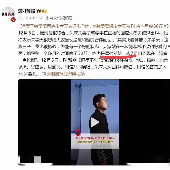 韩雯雯说朱孝天是被踢出F4, 而不是主动退出的。 这话我信,因为朱孝天没理由选择不合体。 朱孝天现在干直播, 需要热度,他有这个需求, F4重新合体对他来说是一个很好的机会, 他怎么可能把送上门的好机会拱手让人。 而其他几人那边就说不准了。 只能说这次这个事弄得不好看,不体面。 粉丝们想看的是真正的F4, 而不是这种东拼西凑来的组合。 喜欢周杰伦的可以去看周杰伦, 喜欢五月天的可以去看五月天, 搞成这样算什么, 年底文艺汇演吗?