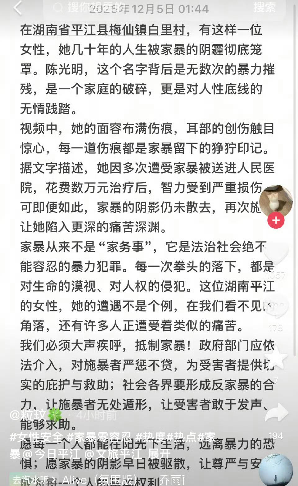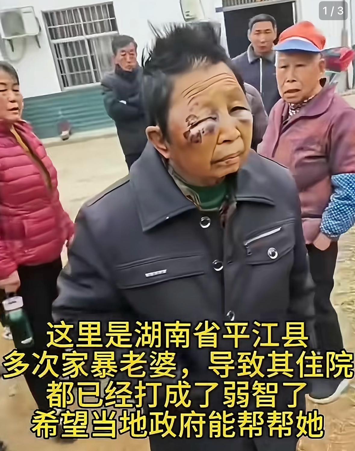 这个老太叫陈光明,可是她的眼睛却要被75岁的老伴打瞎了。他们住在湖南平江梅仙镇百里村,老伴是个酒鬼,据说几十年里老太都生活在家暴的阴影下,数不清的被殴打,老太已经有点神智不清,却依然没有逃脱魔爪。这样的事情当地人应该都知道,为什么无解?因为那是家务事,就算分开了,老太谁养?所以最后他们还是会住一起,老头暴躁脾气不可能改,喝酒成瘾不能改。陈光老师 陈光标家阿姨